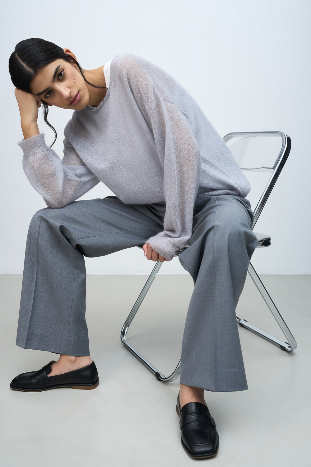 Loose fit jumper with dropped shoulders and ribbed edges. The jumper is made of the finest yarn - superkid mohair blend.