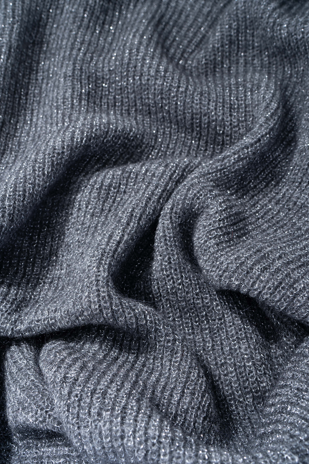Knitted jumper with lurex. The model has a loose silhouette with dropped shoulders and a knitted collar.