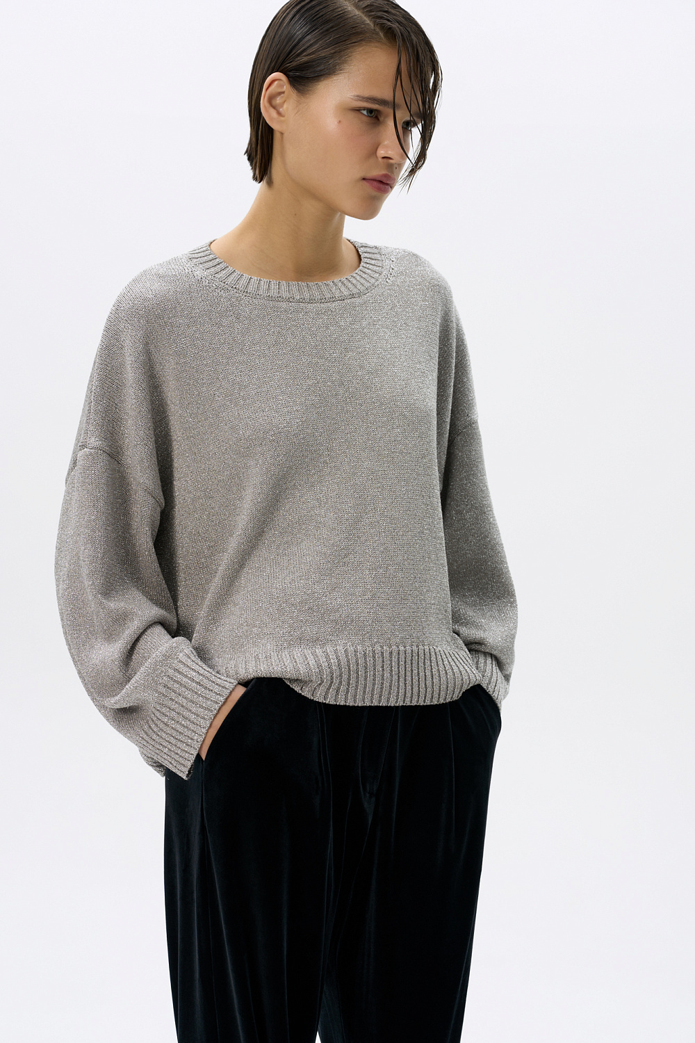 Knitted jumper made of viscose with the addition of lurex. Loose silhouette model with a round neckline and dropped shoulders.