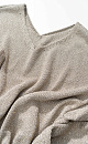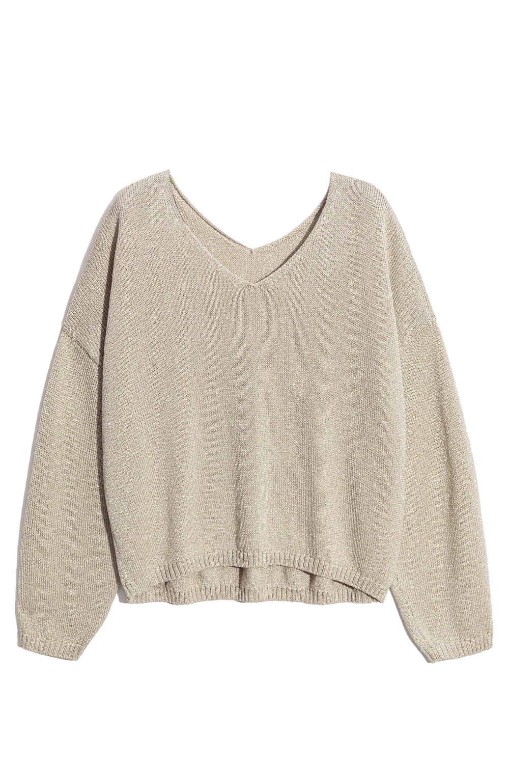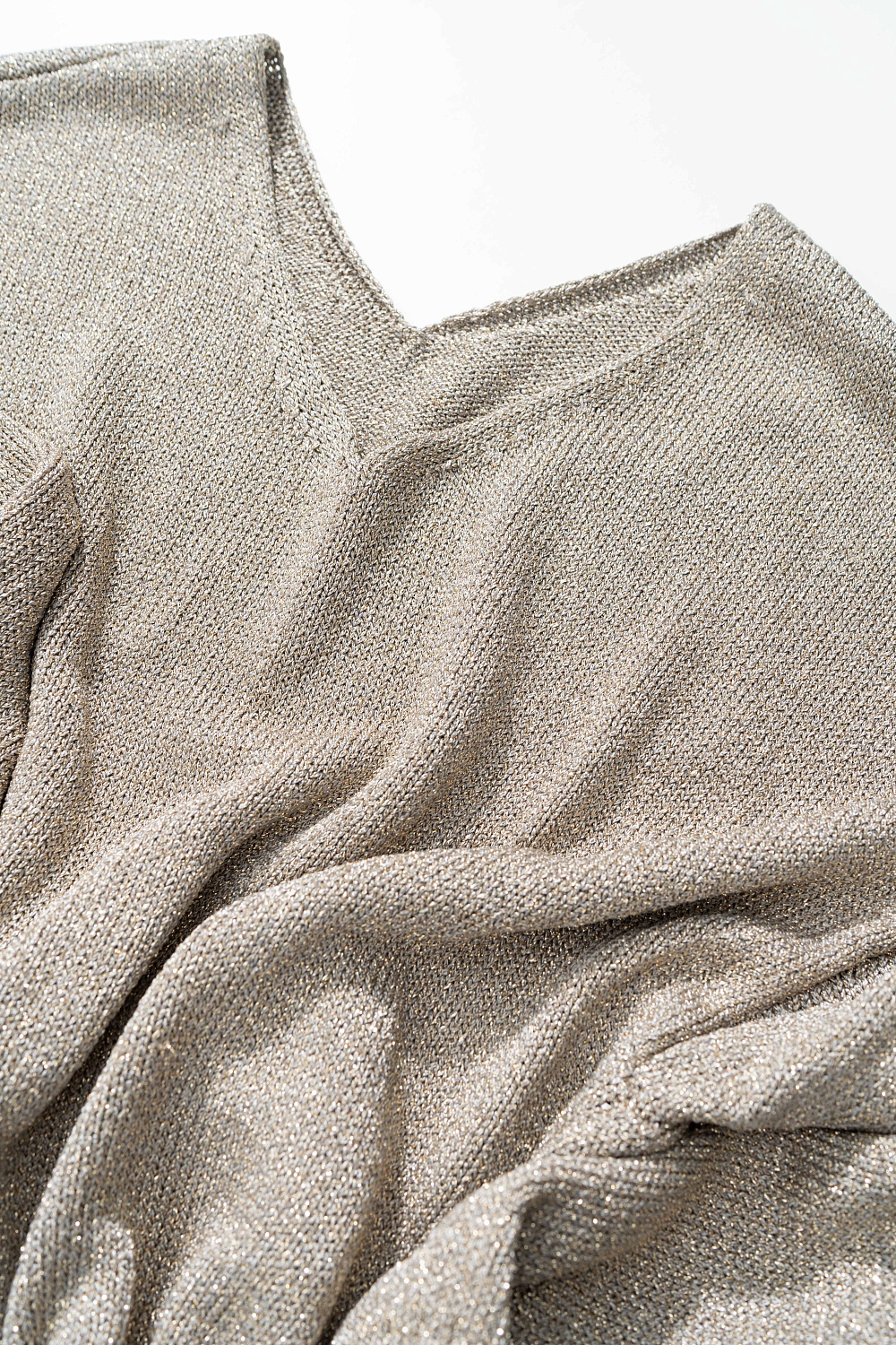 Jumper made of viscose with the addition of lurex. The model has a loose silhouette, with dropped shoulders and a V-neck. The sleeve cuffs and hem are ribbed.