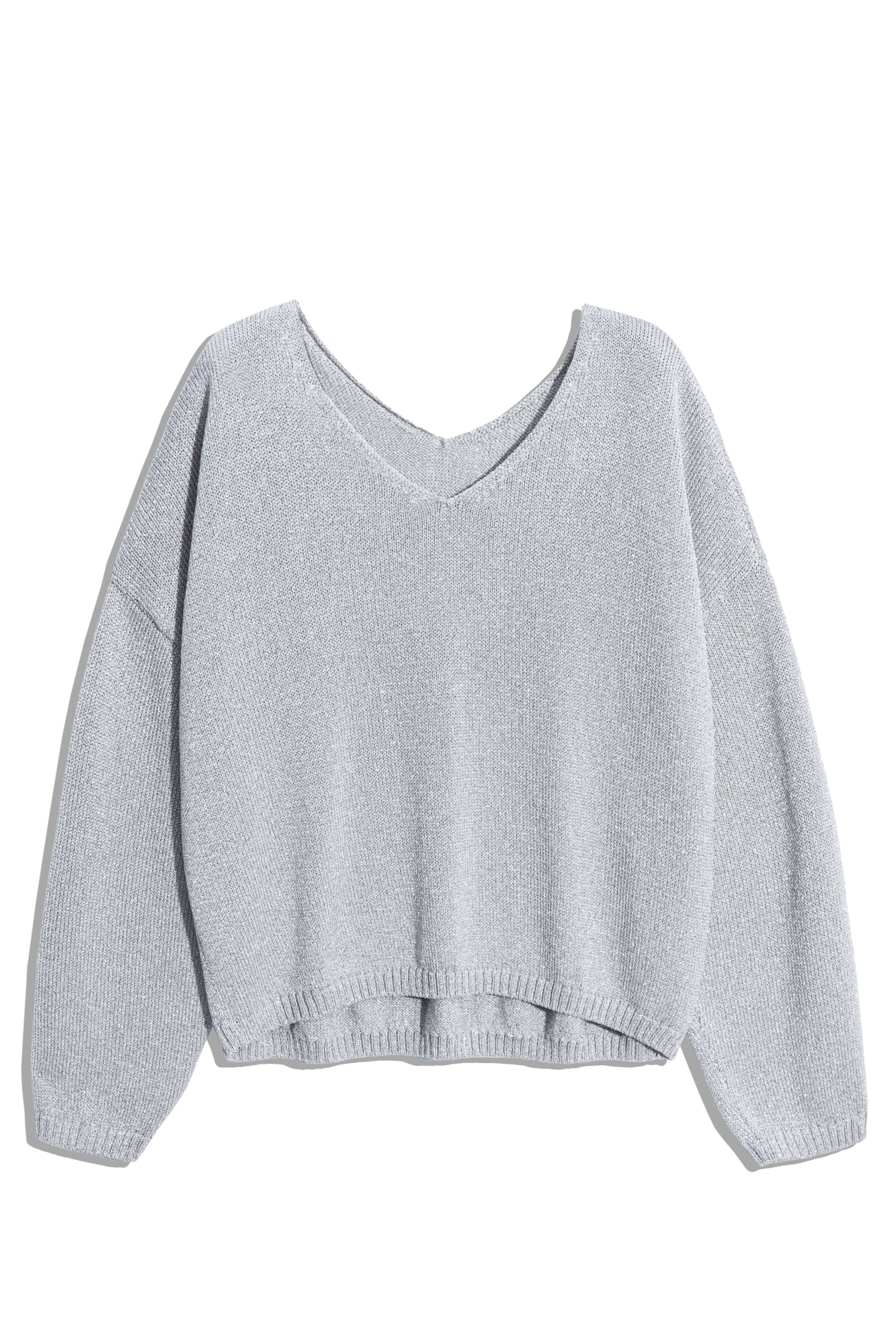 Jumper made of viscose with the addition of lurex. The model has a loose silhouette, with dropped shoulders and a V-neck. The sleeve cuffs and hem are ribbed.