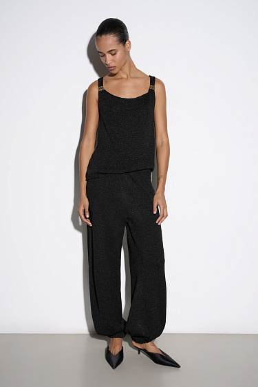 Longsleeve made of viscose with lurex. Model with a boat neckline and long sleeves. The cuffs of the sleeves and the bottom of the product are decorated with bolsters.