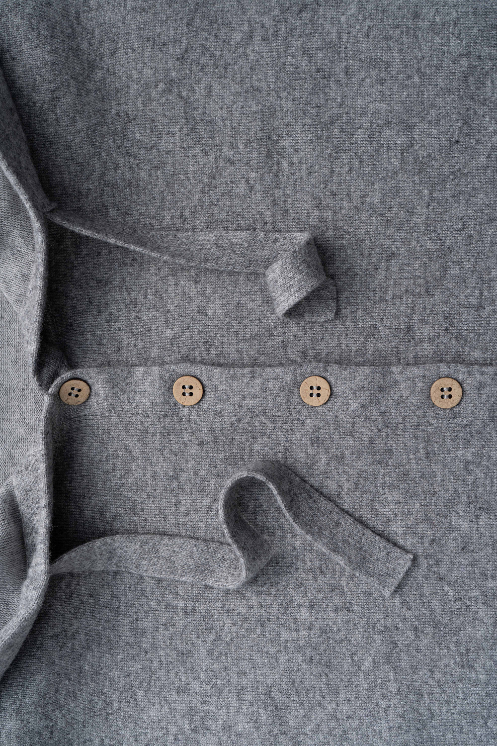 Knitted overalls made of wool and cashmere, consisting of a hoodie and trousers. Hoodie with a hood and button fastening, trousers with a wide elastic waistband, side pockets and elasticated cuffs.