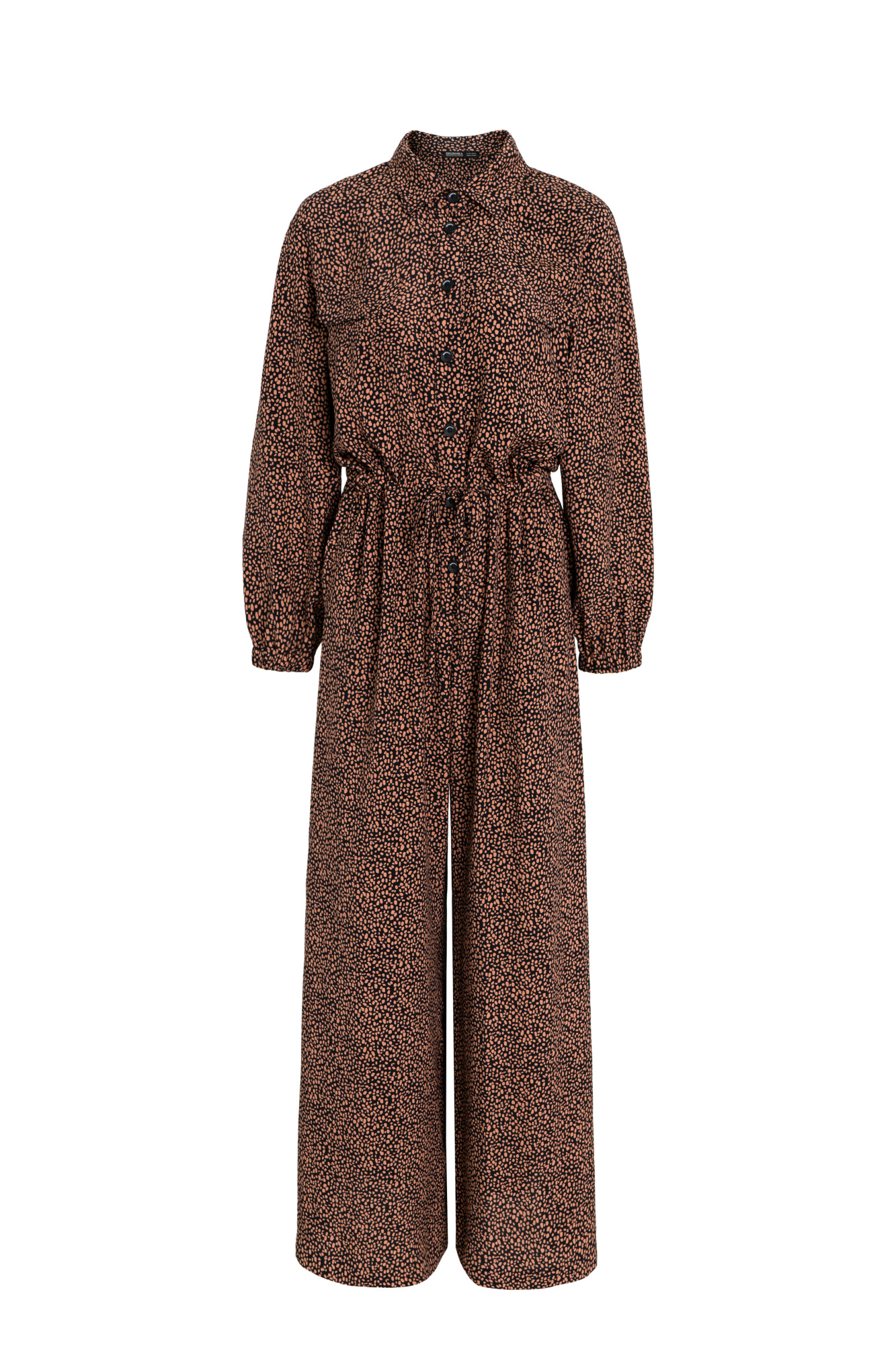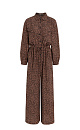 Printed jumpsuit in 100% viscose with a tie belt and button closure.