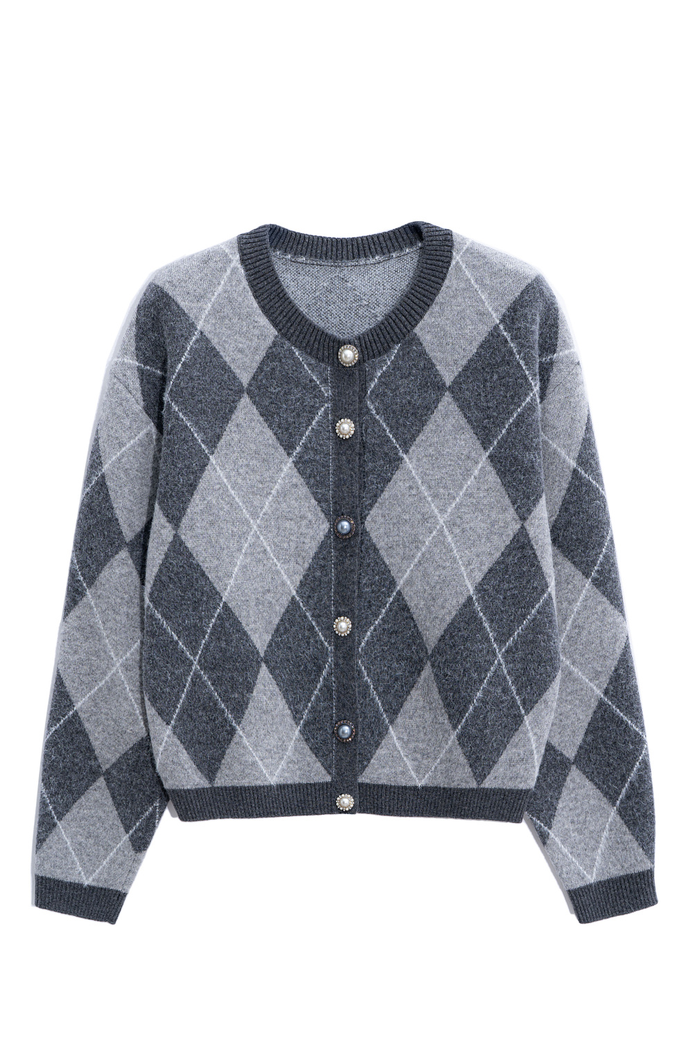 Argyle knitted cardigan made from wool and cashmere. The model has a loose silhouette with dropped shoulders, a round neckline and a fastening with large buttons. The edges of the product are ribbed.