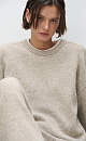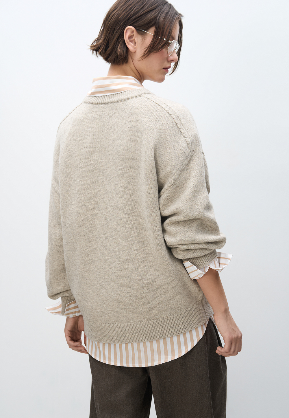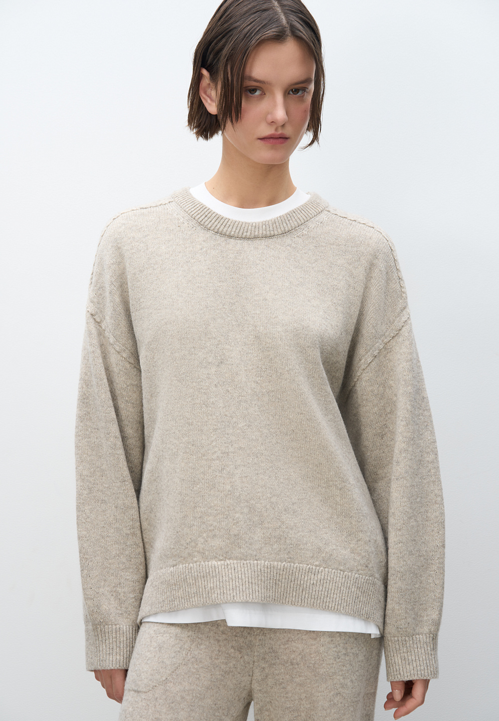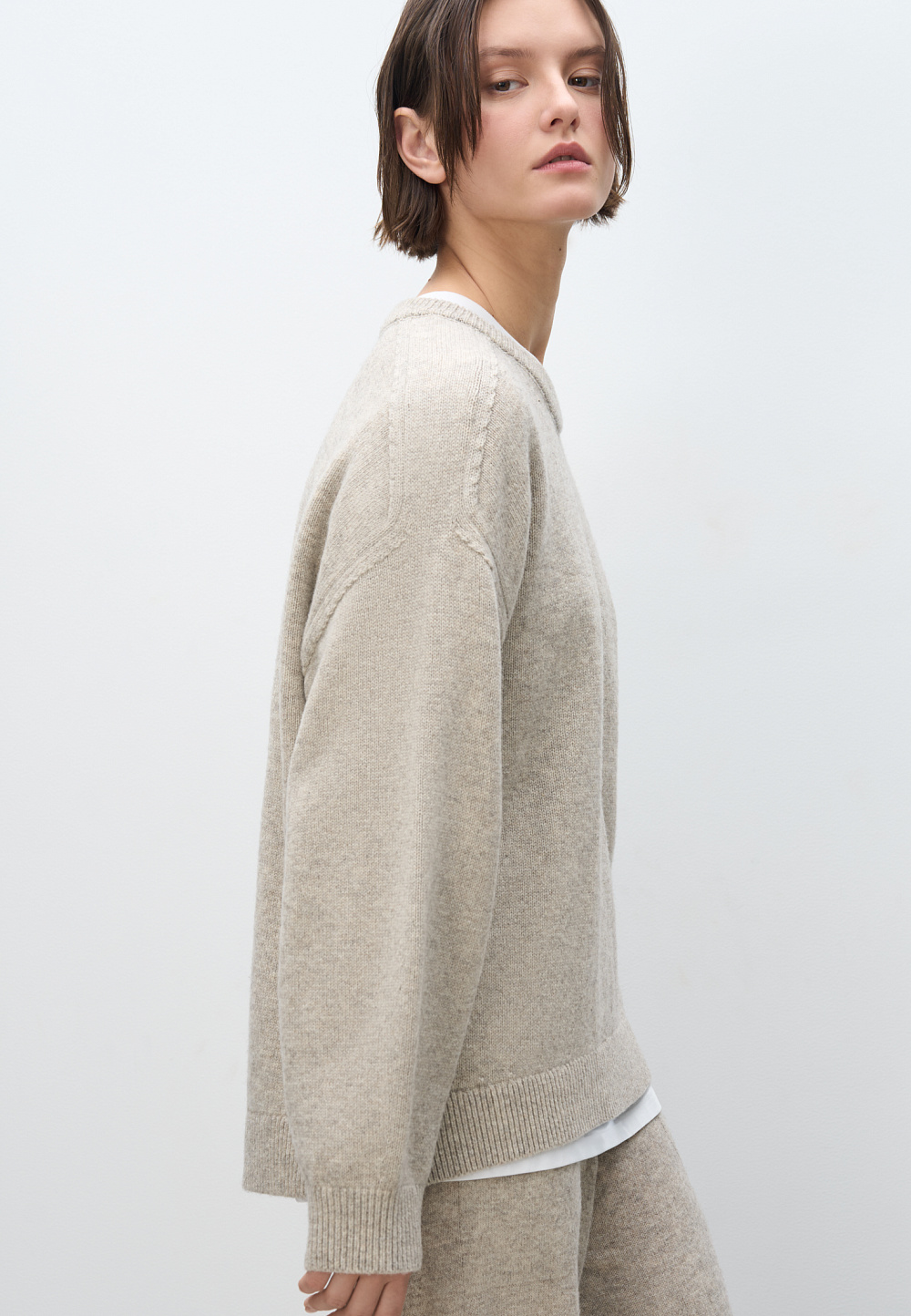 Knitted jumper made of yak wool with the addition of extrafine merino wool. Model of a loose silhouette, with a knitted round neck and raglan sleeves with decorative allowances. The hem and sleeve cuffs are ribbed.