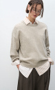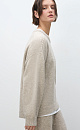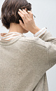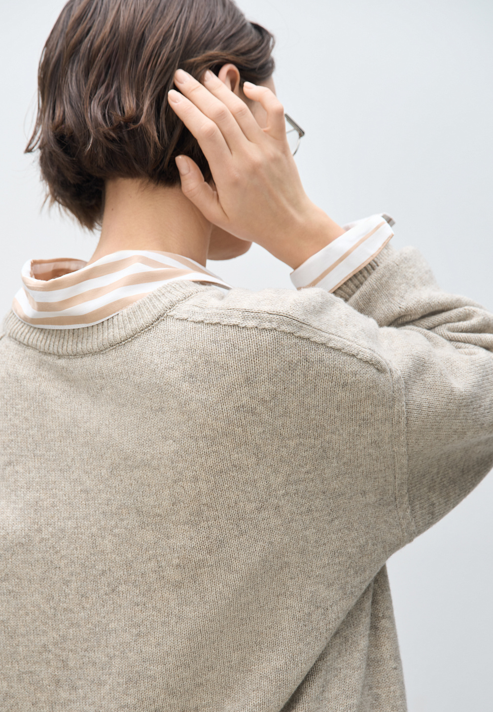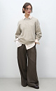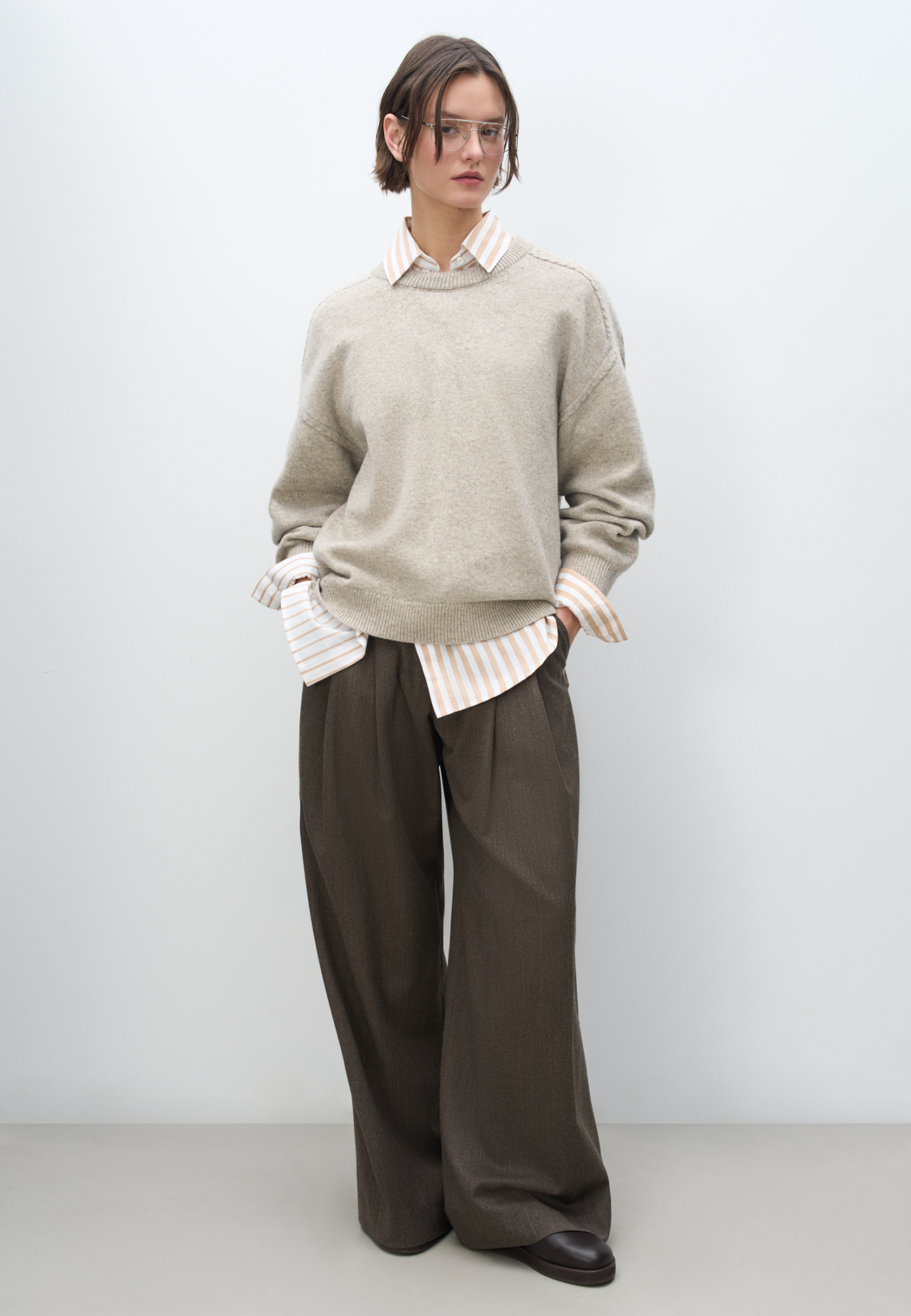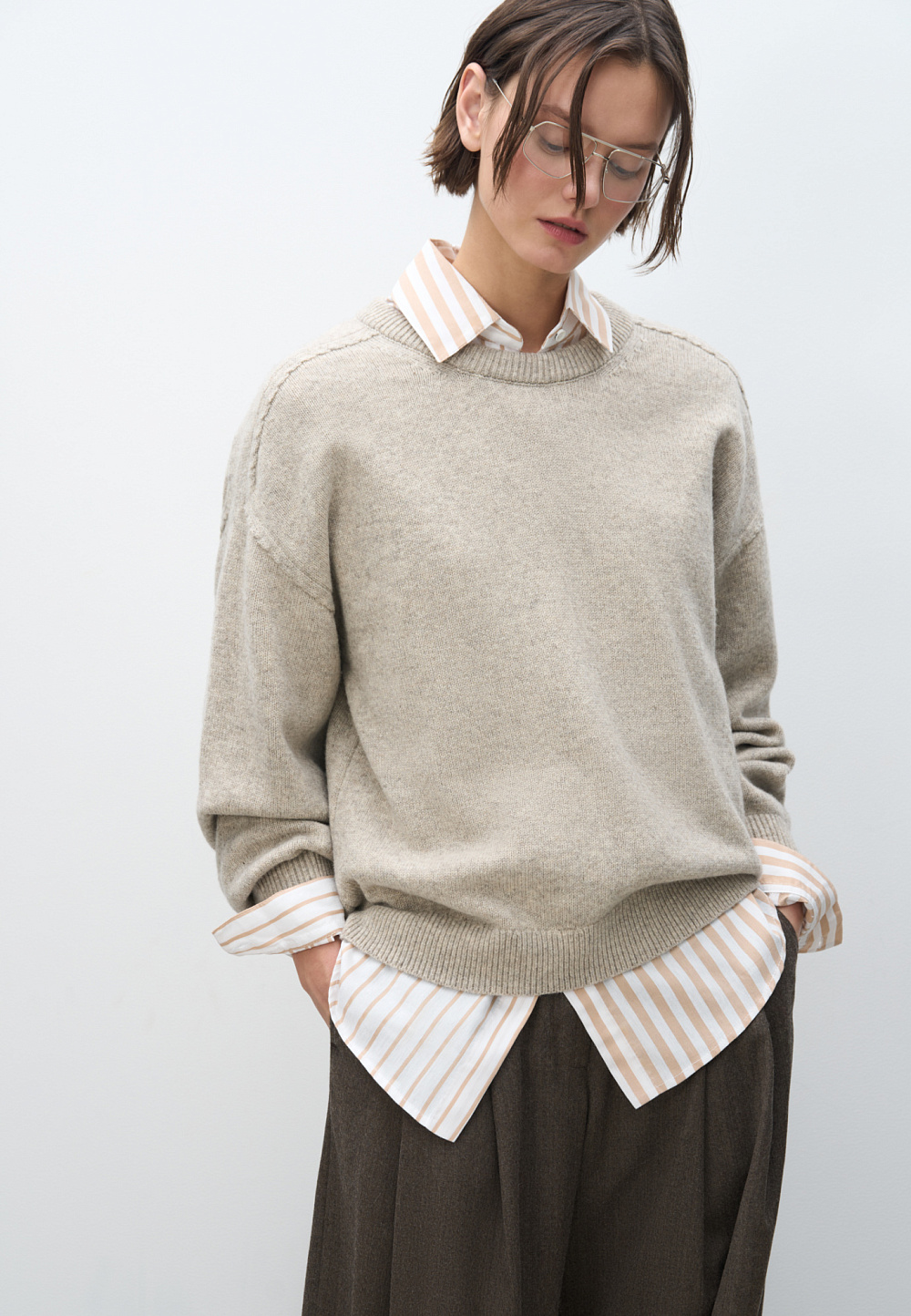 Knitted jumper made of yak wool with the addition of extrafine merino wool. Model of a loose silhouette, with a knitted round neck and raglan sleeves with decorative allowances. The hem and sleeve cuffs are ribbed.