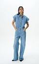 Denim jumpsuit with short sleeves and turn-down collar, button closure and hidden zipper.