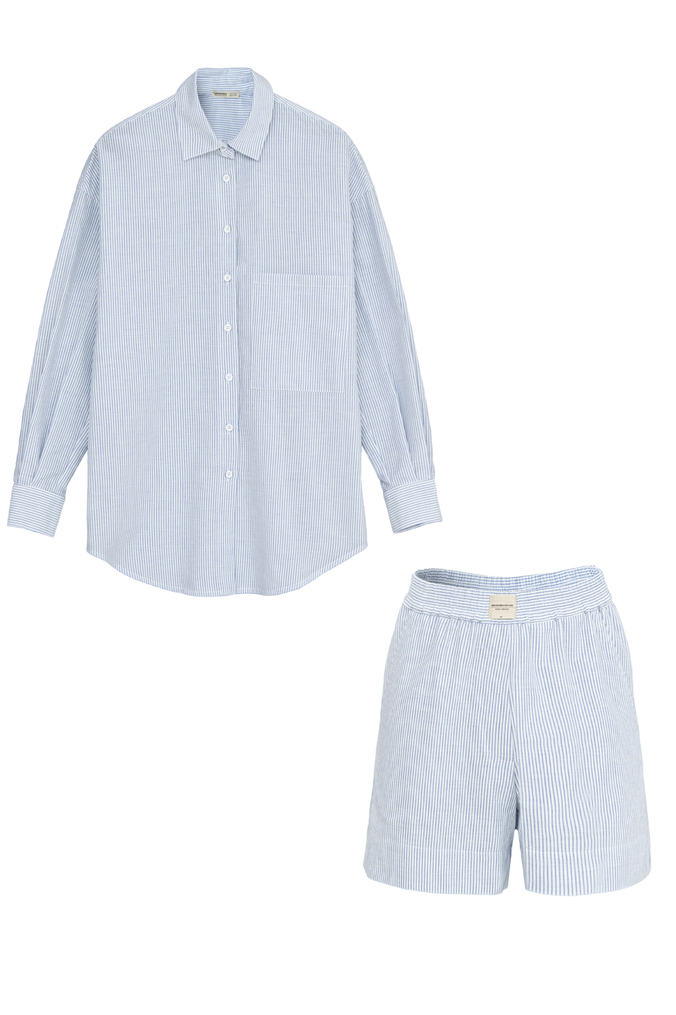 100% cotton set includes a shirt with a patch pocket and shorts with side pockets and a logo at the waist.