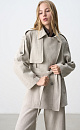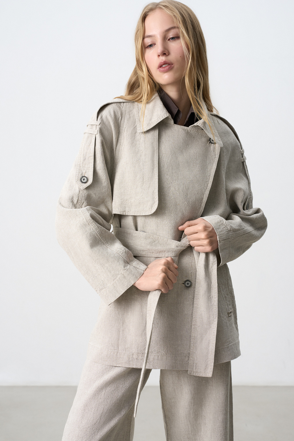 Double-breasted trench coat made of 100% linen. Straight cut model with turn-down collar and yoke. The product is decorated with patties on the shoulders. Two side pockets. Button closure. Belt included.