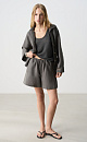 Short shorts made of 100% linen. Straight cut model with slight flaring at the bottom. The product is made with a belt with a drawstring. Two side pockets.