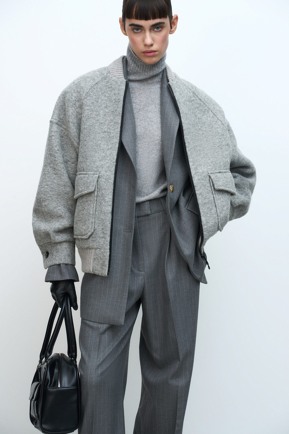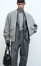 Oversized wool bomber jacket. Ribbed neckline and hem. Two front pockets with flaps. Front zip fastening.