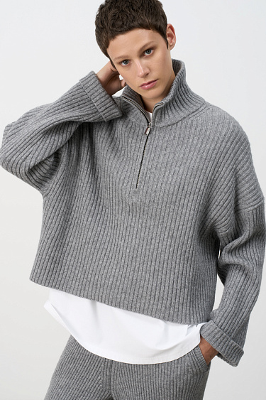 Oversized wool bomber jacket. Ribbed neckline and hem. Two front pockets with flaps. Front zip fastening.