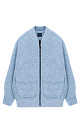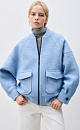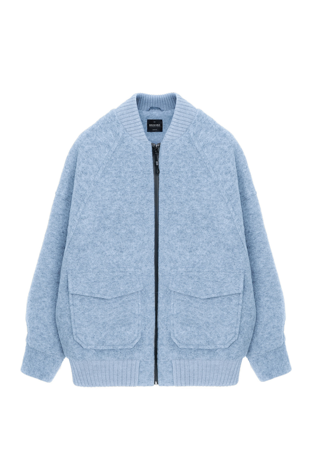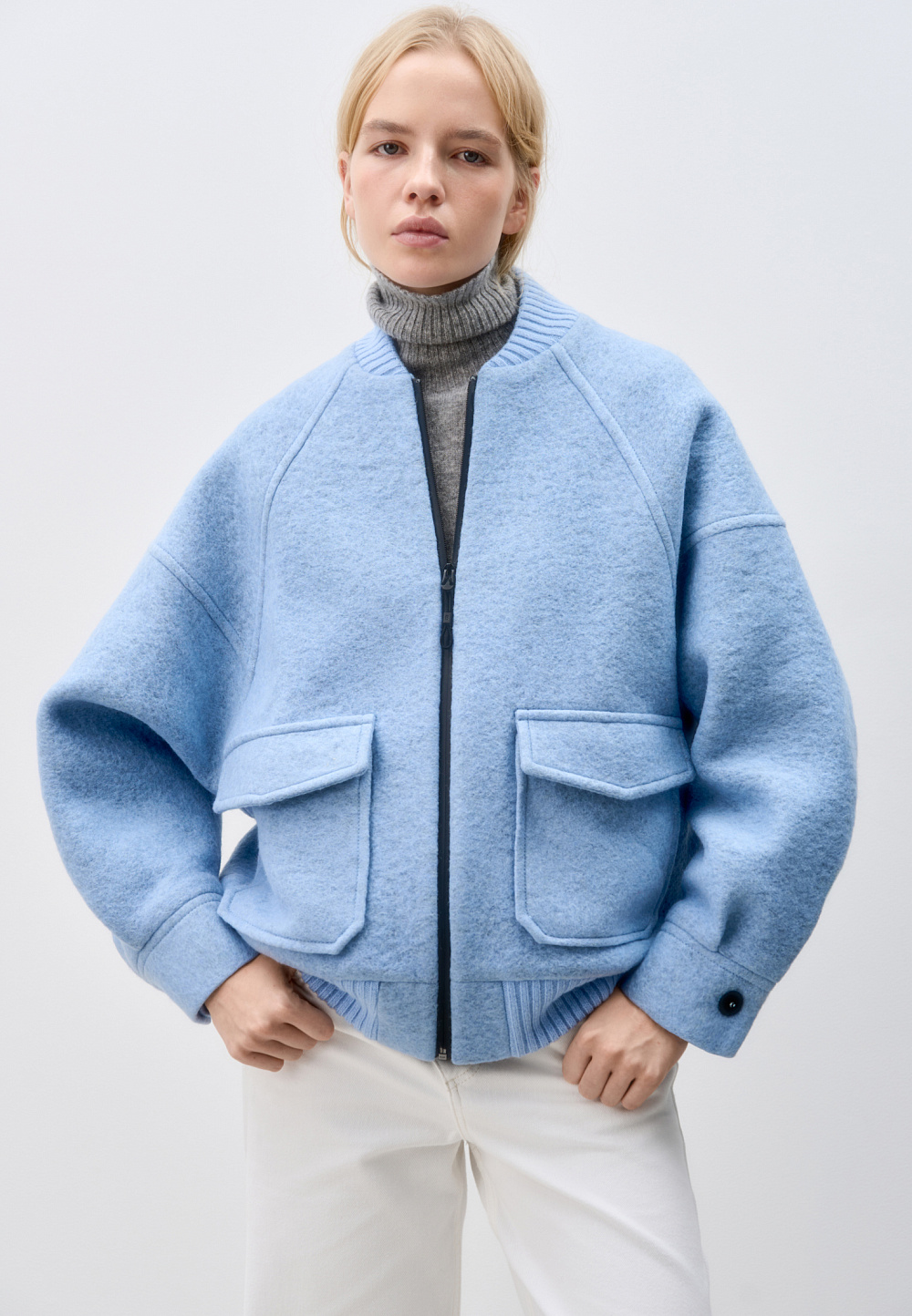 Oversized wool bomber jacket. Ribbed neckline and hem. Two front pockets with flaps. Front zip fastening.