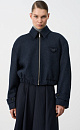 Wool bomber jacket with turn-down collar. Model of a straight silhouette with shoulder pads and an imitation pocket on the chest. Long sleeves with patches at the cuffs. The collar is decorated with an eco-leather insert. Zip closure. The product is lined.