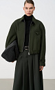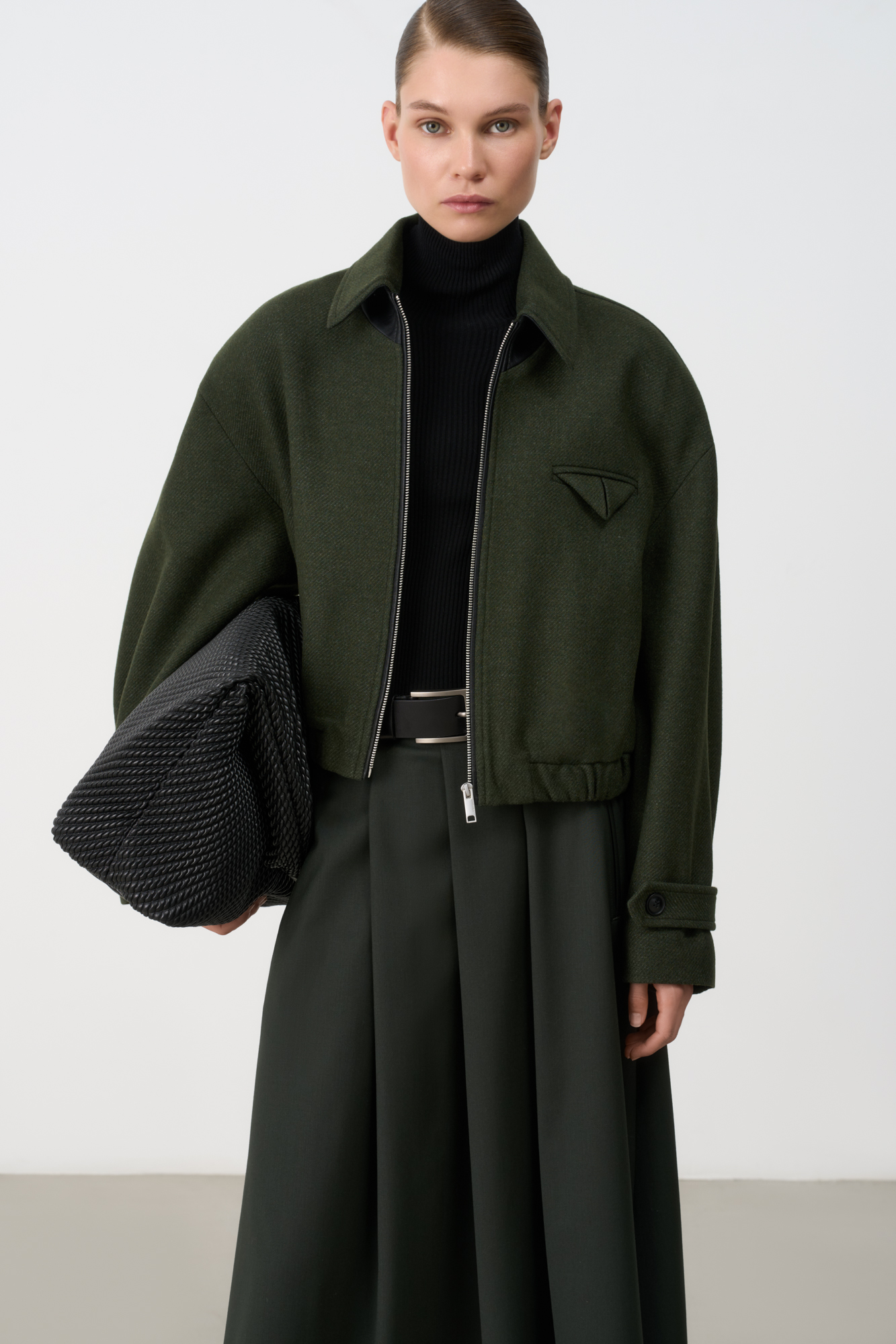 Wool bomber jacket with turn-down collar. Model of a straight silhouette with shoulder pads and an imitation pocket on the chest. Long sleeves with patches at the cuffs. The collar is decorated with an eco-leather insert. Zip closure. The product is lined.