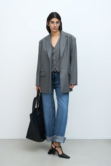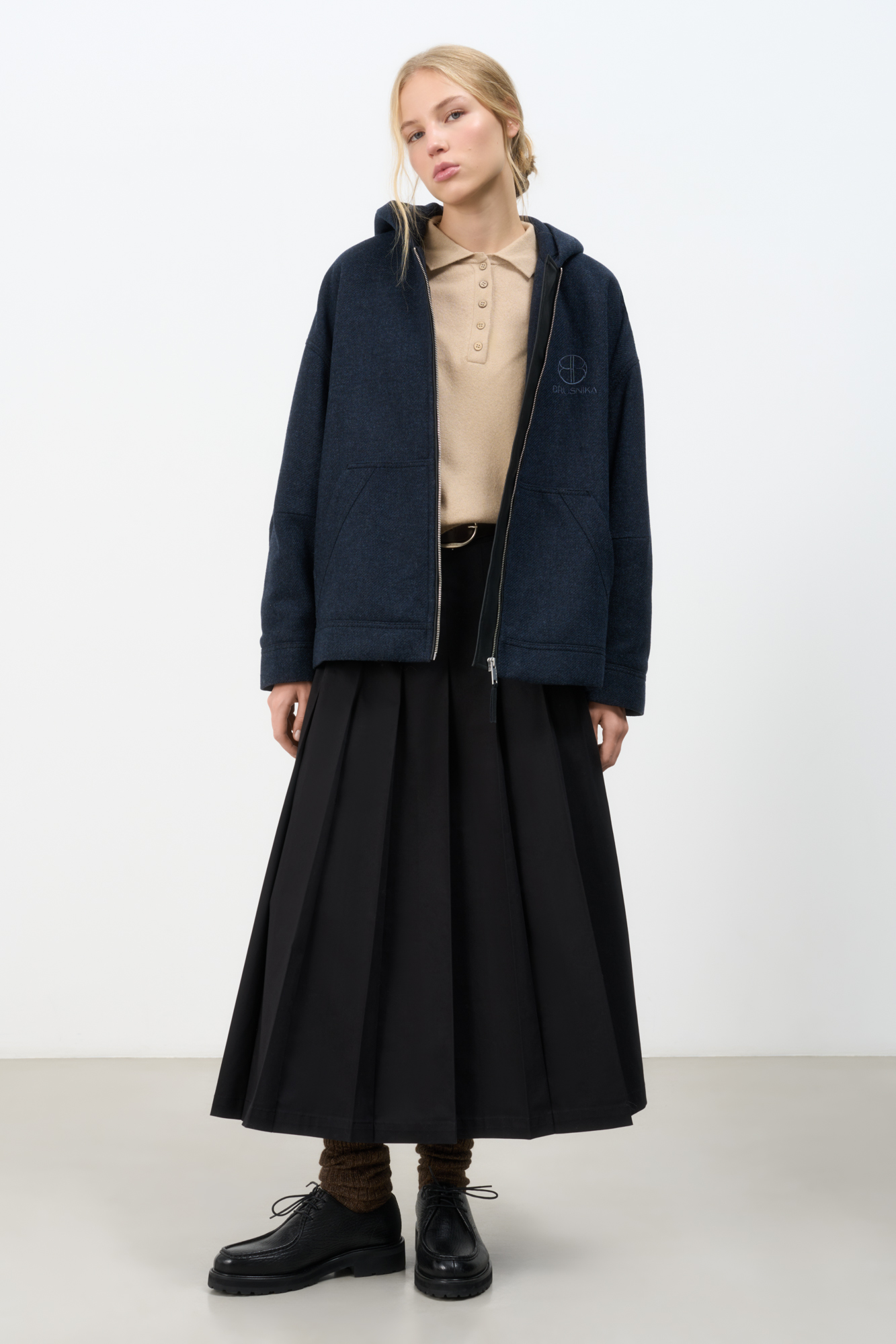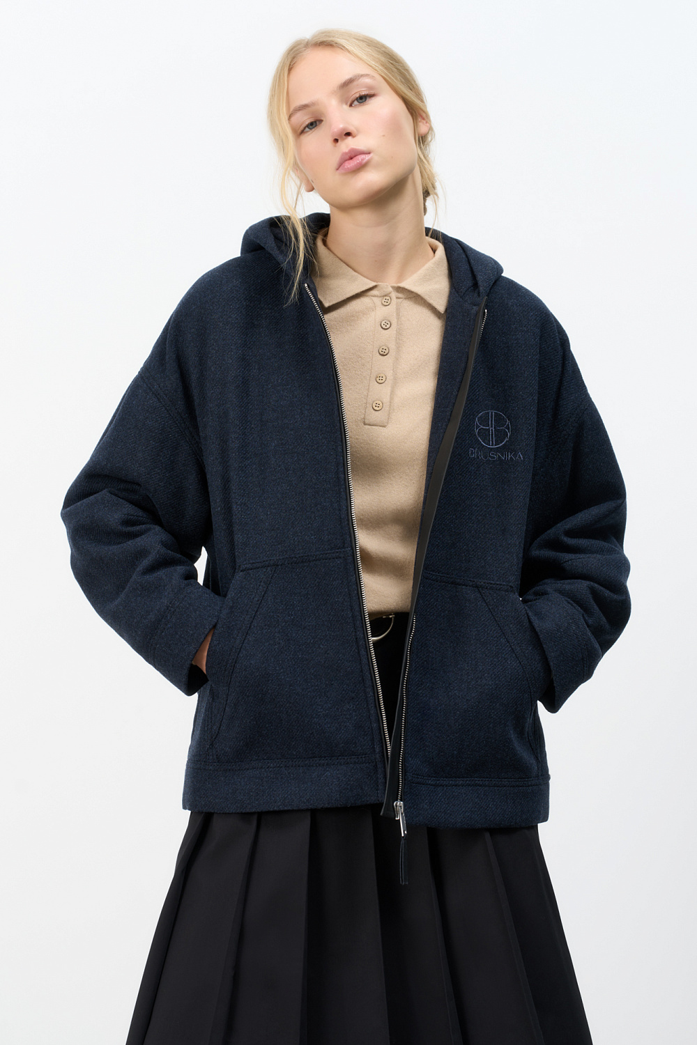 Loose bomber jacket with a hood. Model with dropped shoulders and side pockets. Embroidered brand logo on the chest. Zip closure. Lined.