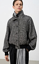 Oversized wool bomber jacket with stand-up collar. Shoulder pads and side pockets. Long sleeves with elasticated cuffs. Button closure. Lined.