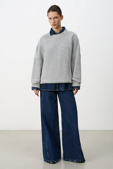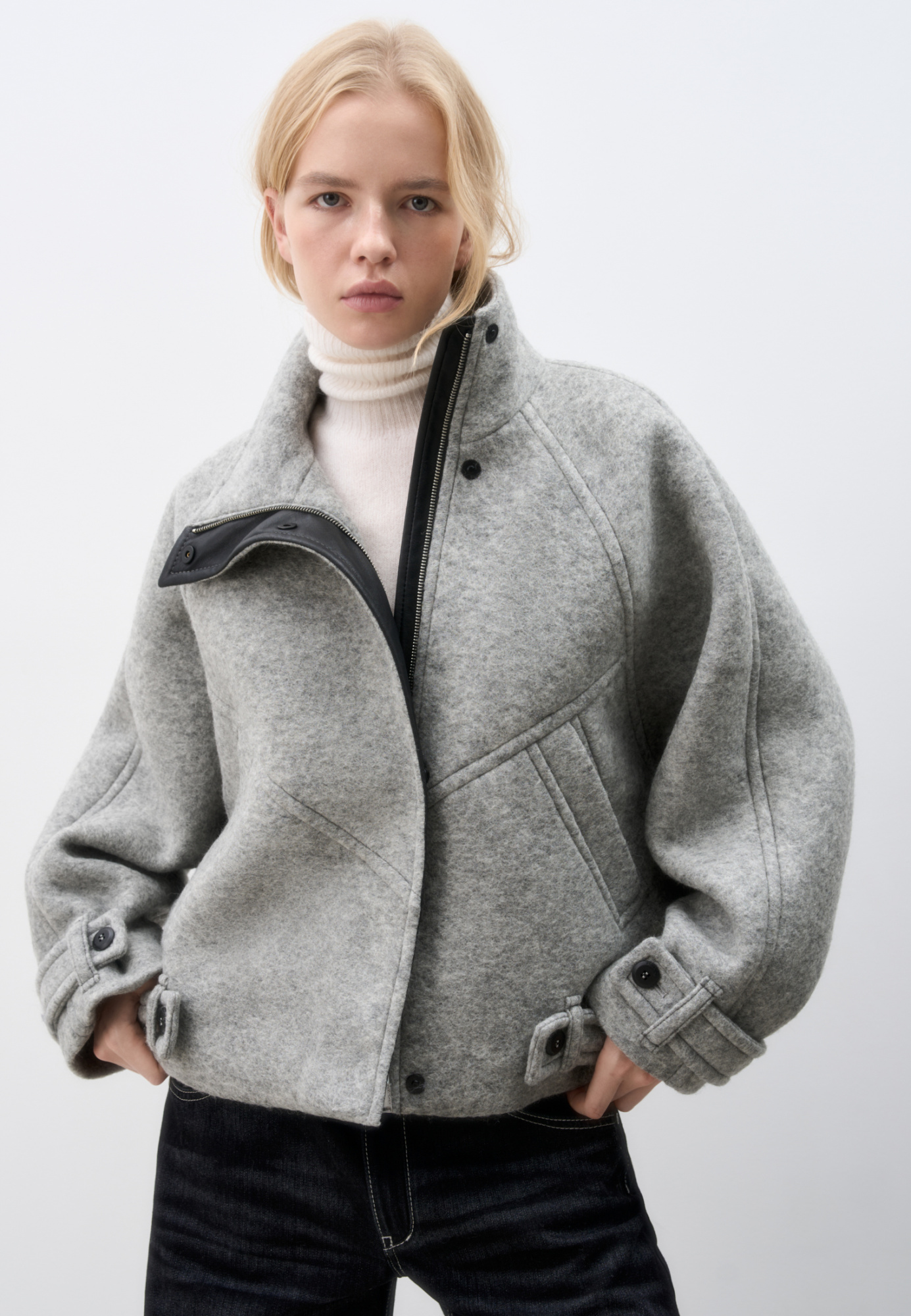 Woolen bomber jacket with a stand collar. Loose-fitting model with button-down cuffs and hem, zip closure and magnetic buttons under the eco-leather-decorated placket. The bomber jacket is lined.