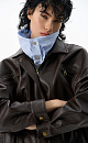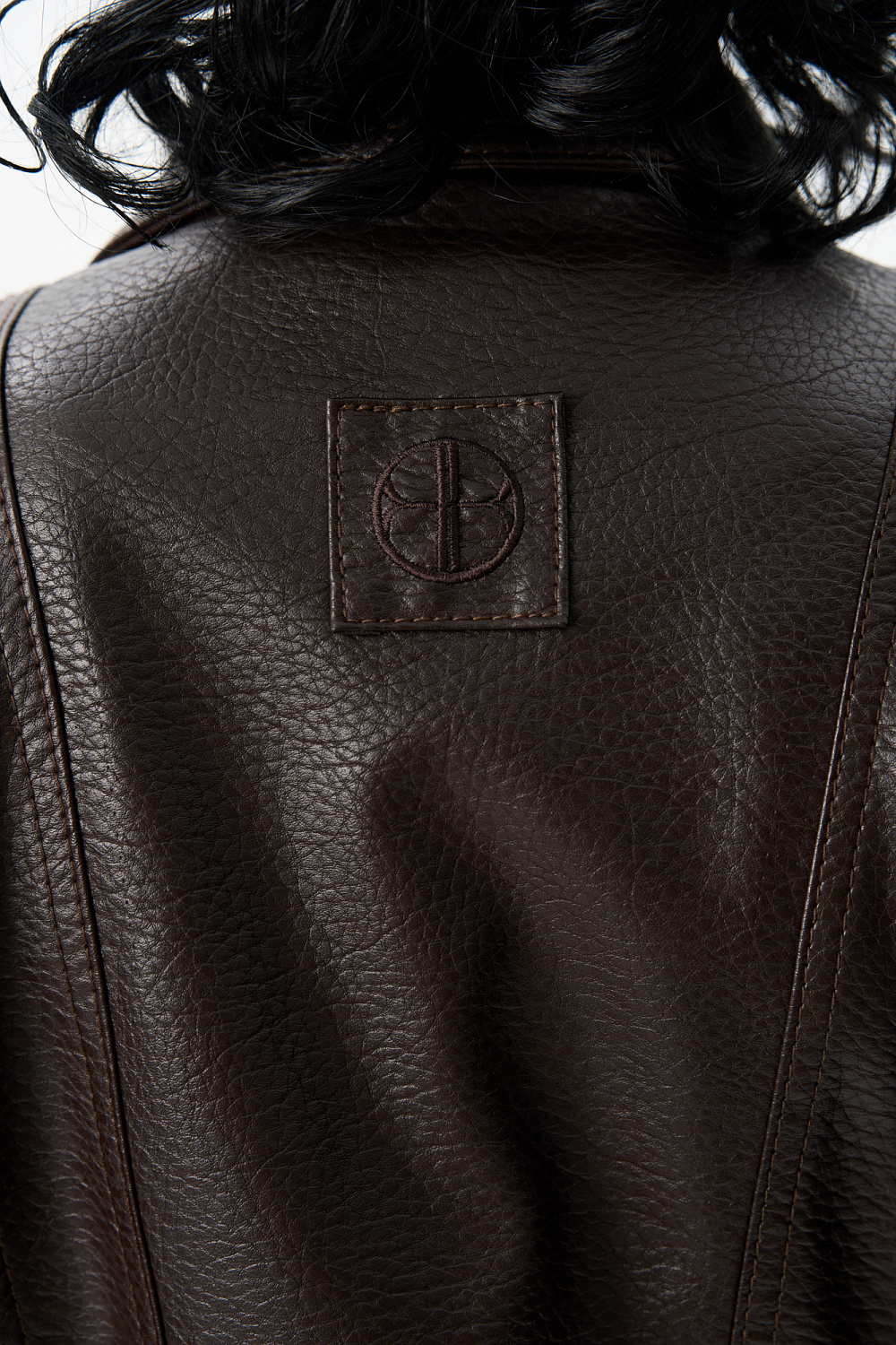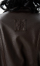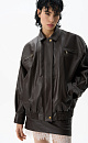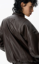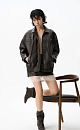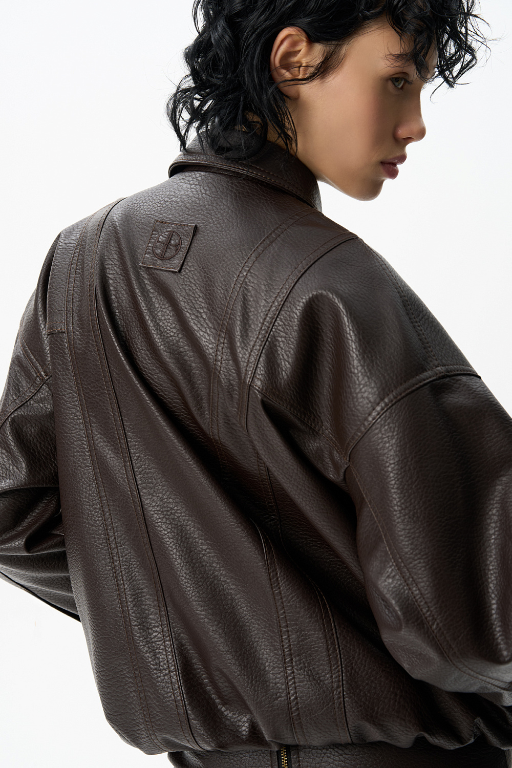 Bomber jacket made of textured eco leather. Loose silhouette model with long sleeves, turn-down collar, two chest pockets with zippers and deep side pockets. Zip fastening and metal buttons on the placket. The product is lined.
