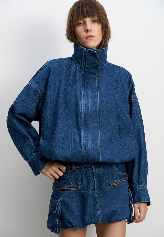 Denim bomber jacket with a stand collar