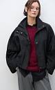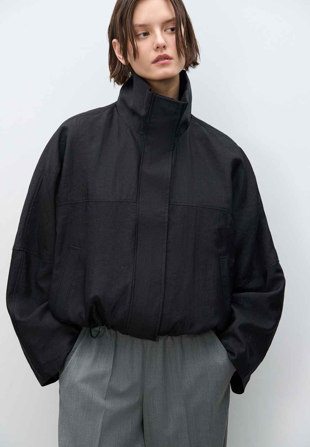 Viscose bomber jacket with stand-up collar. Loose silhouette model with dropped shoulders and side pockets. The bottom of the product is made with elastic. Zip fastening under the placket with buttons.