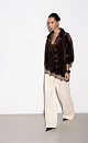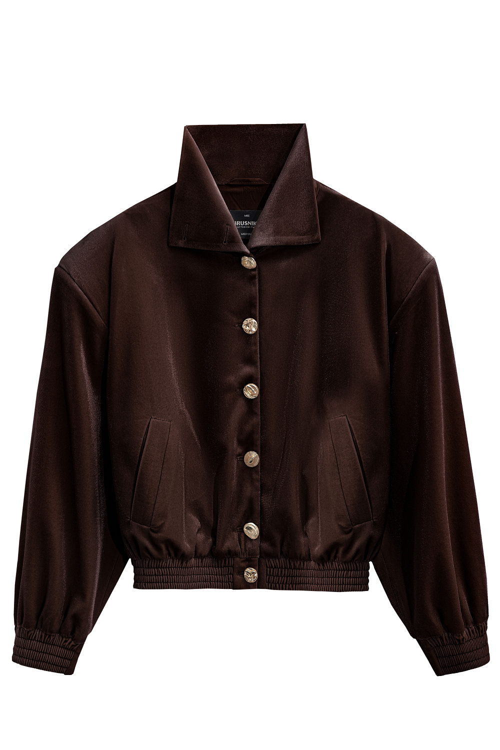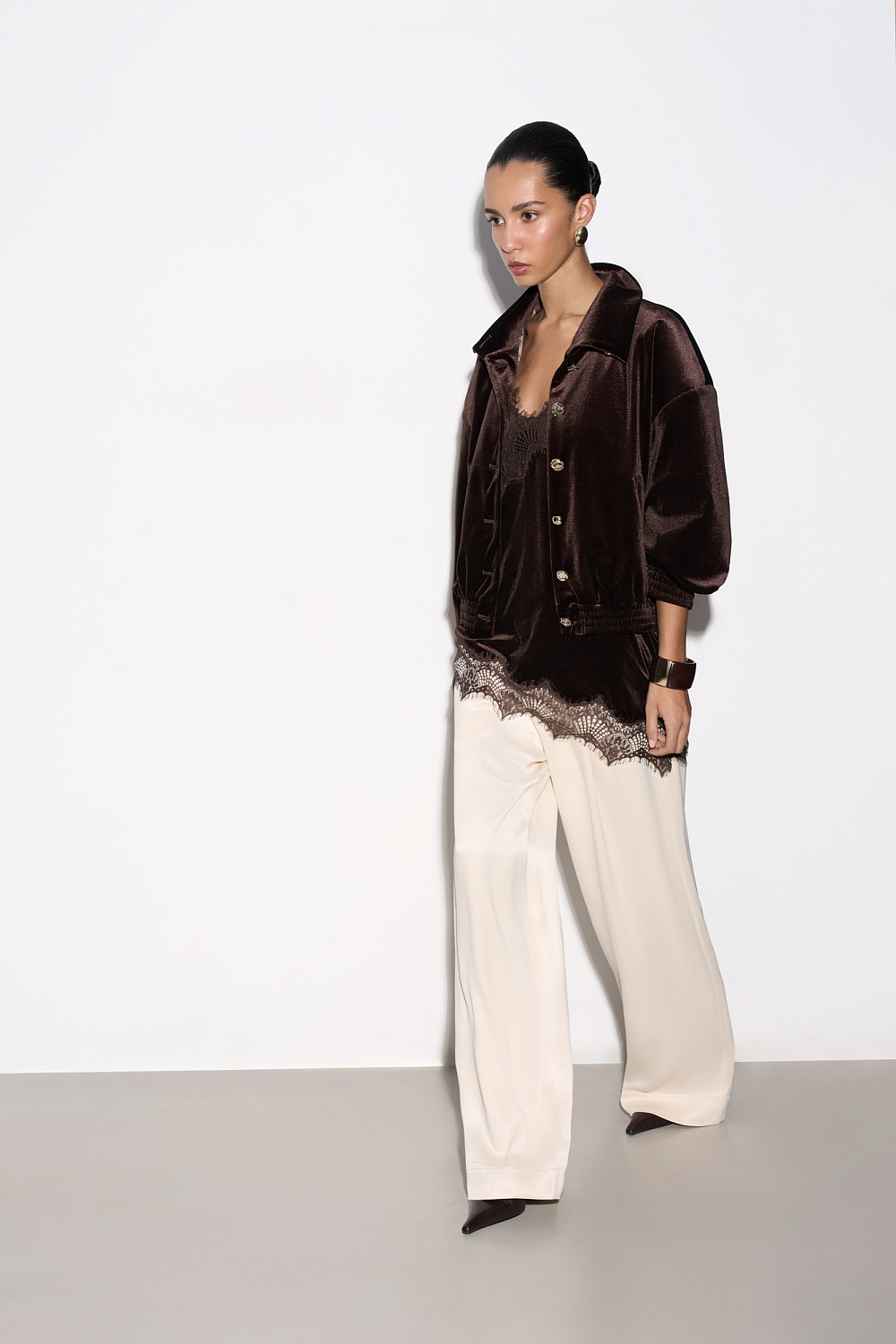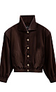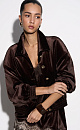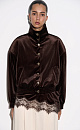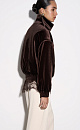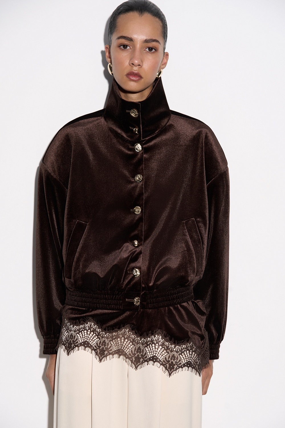 Velvet bomber jacket with stand-up collar. Loose fit model with dropped shoulders and side pockets. The cuffs of the sleeves and the bottom of the product are made with elastic. Accent button closure.