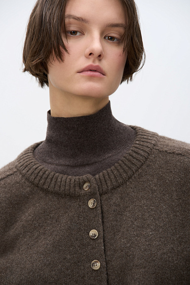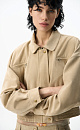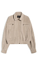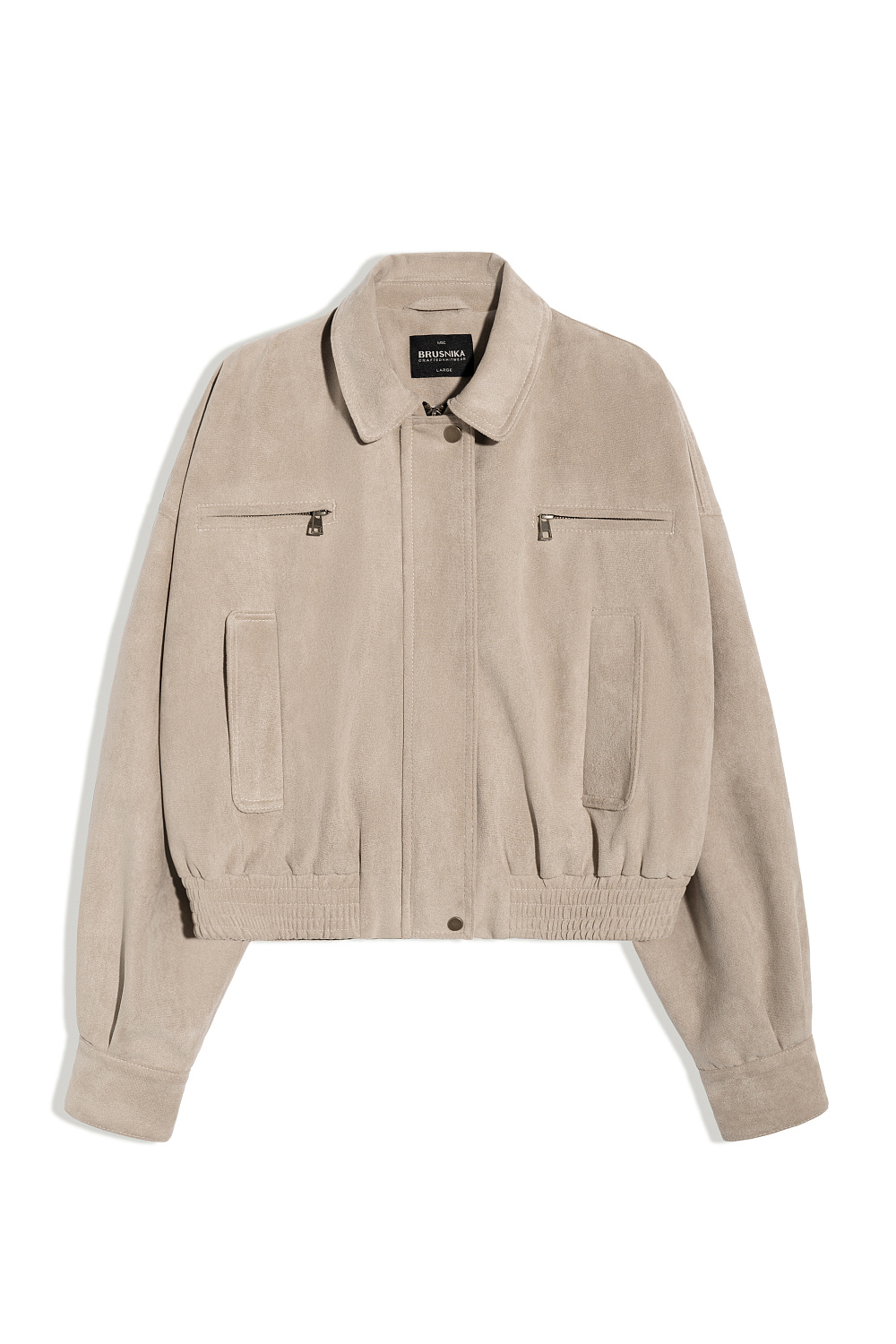 Suede bomber jacket with turn-down collar. The model has a loose silhouette with dropped shoulders, two chest pockets with a zipper and two side pockets. The bottom of the product is made with elastic. Zip fastening under the placket. Lined.