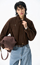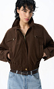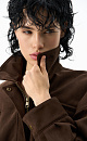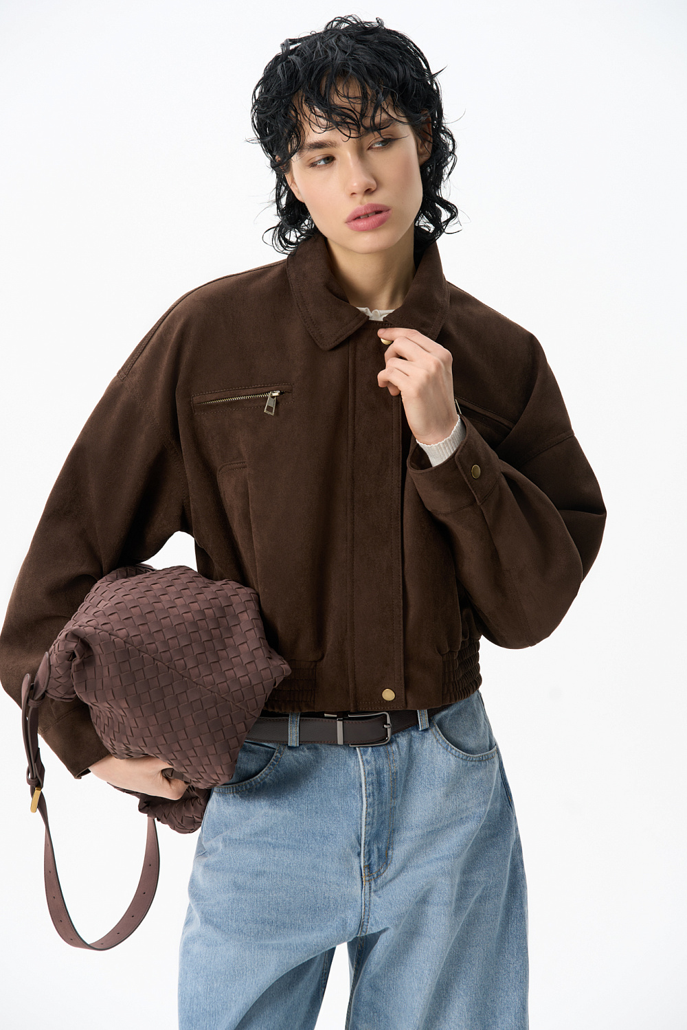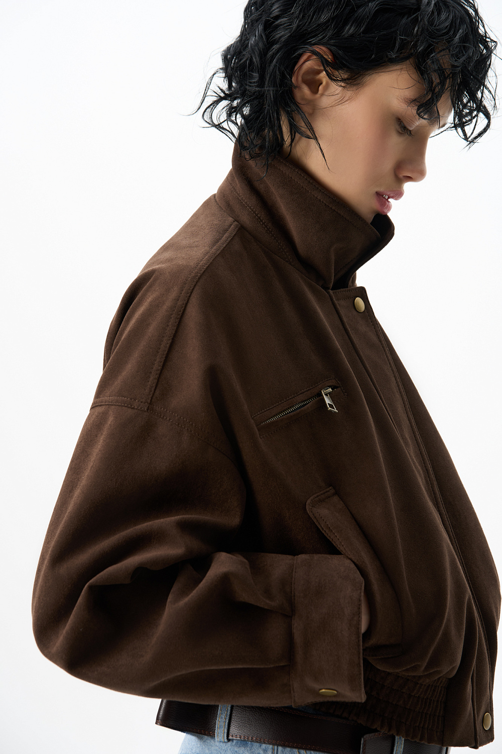 Suede bomber jacket with turn-down collar. The model has a loose silhouette with dropped shoulders, two chest pockets with a zipper and two side pockets. The bottom of the product is made with elastic. Zip fastening under the placket. Lined.