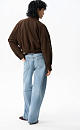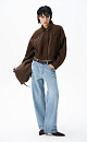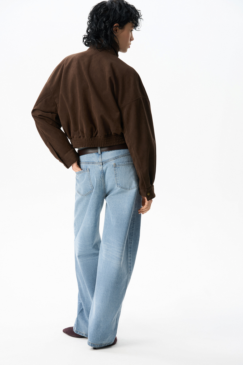 Bomber jacket made of fabric with an imitation of the appearance and properties of natural suede. The model has a loose silhouette with dropped shoulders, a turn-down collar, two chest pockets with a zipper and two side pockets. The bottom of the product is made with elastic. Zip fastening under the placket. Lined.