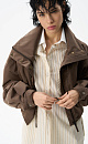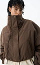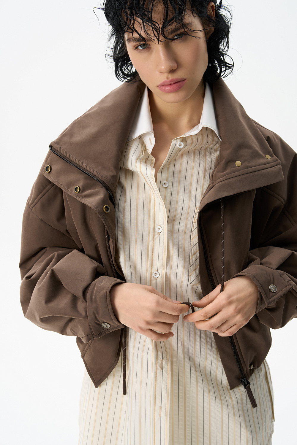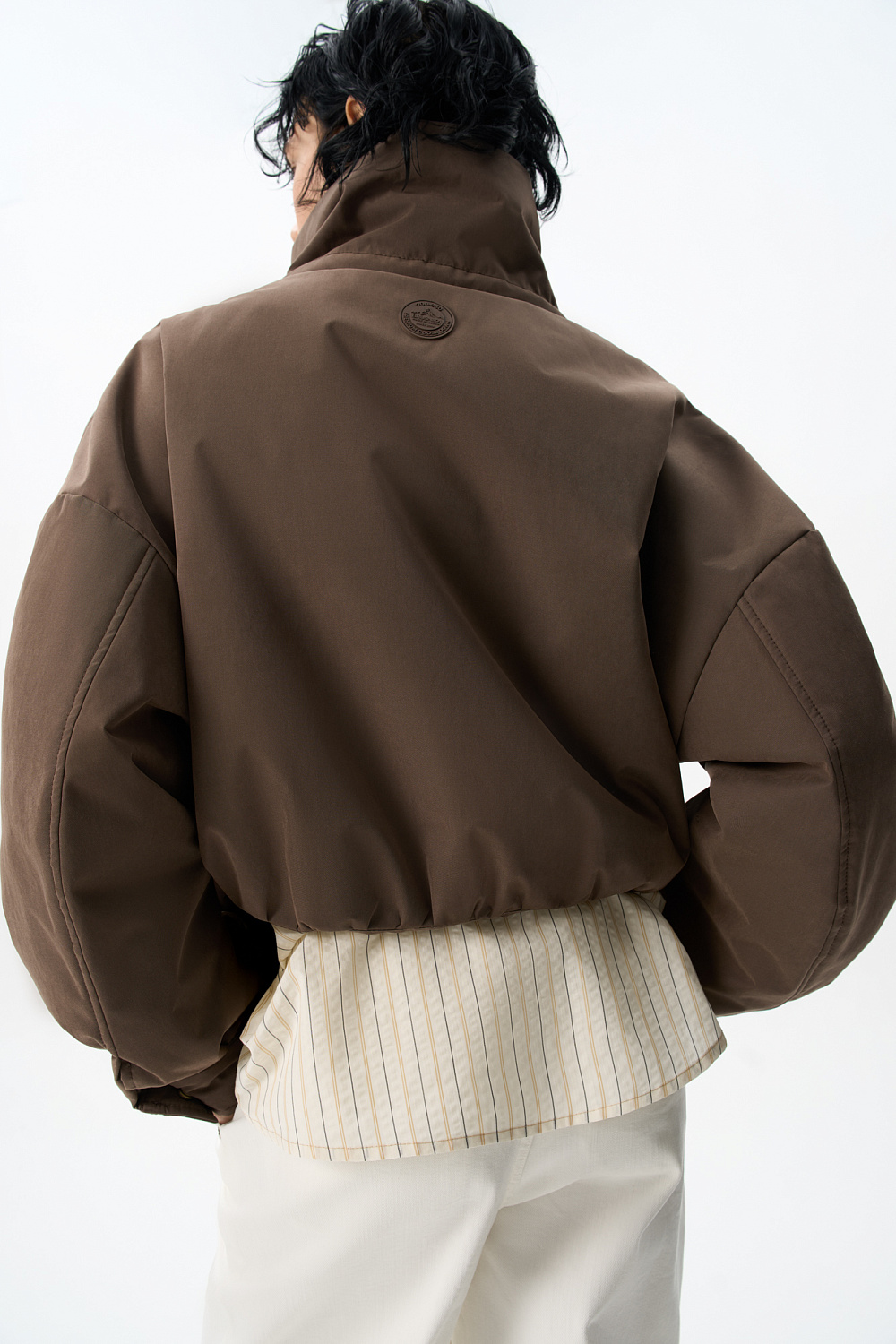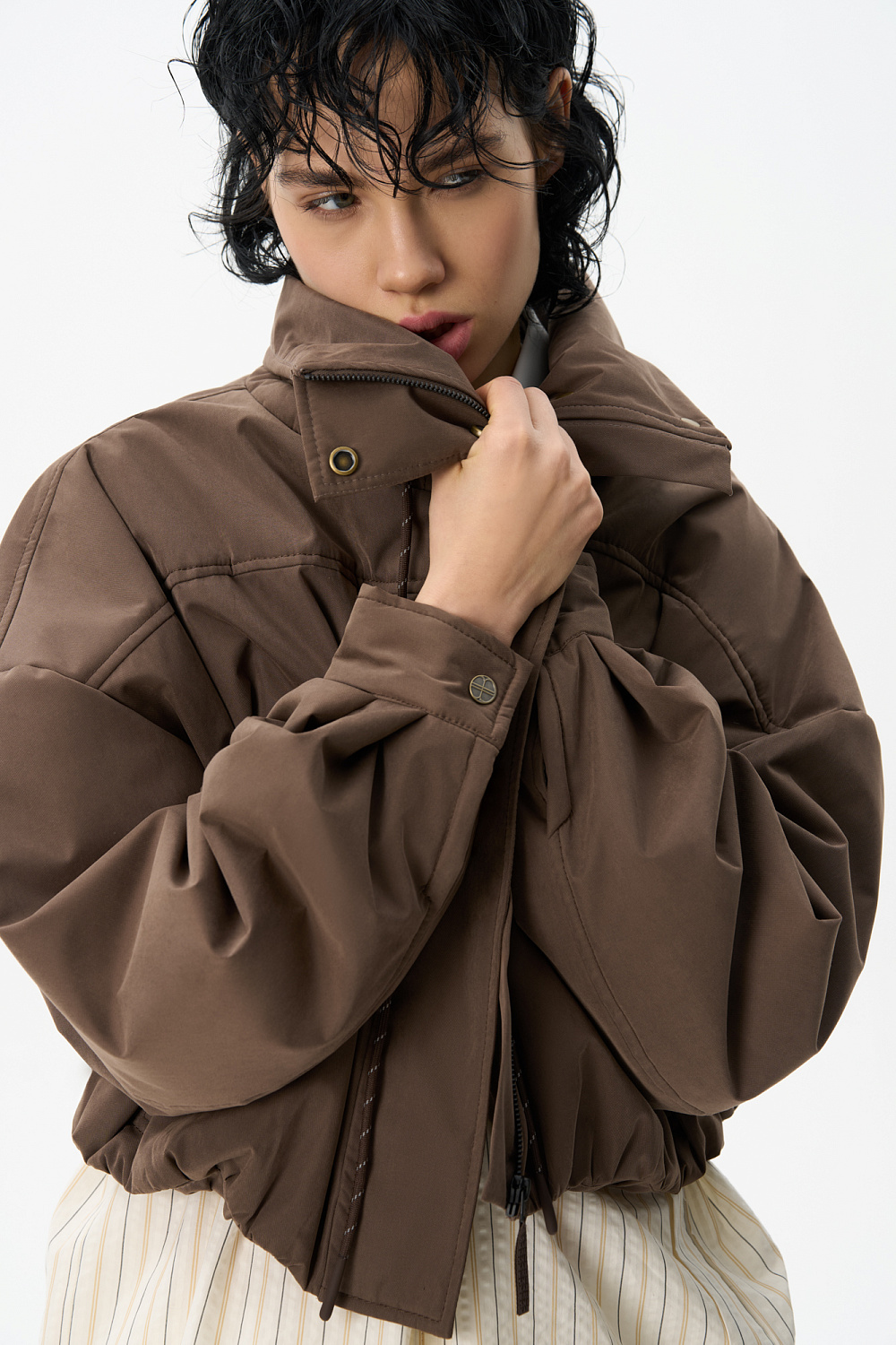 Oversized bomber jacket with a stand-up collar. The model features a cropped silhouette with dropped shoulders, deep slit pockets and a zipper closure with a placket with buttons. The sleeve cuffs are decorated with metal branded buttons.