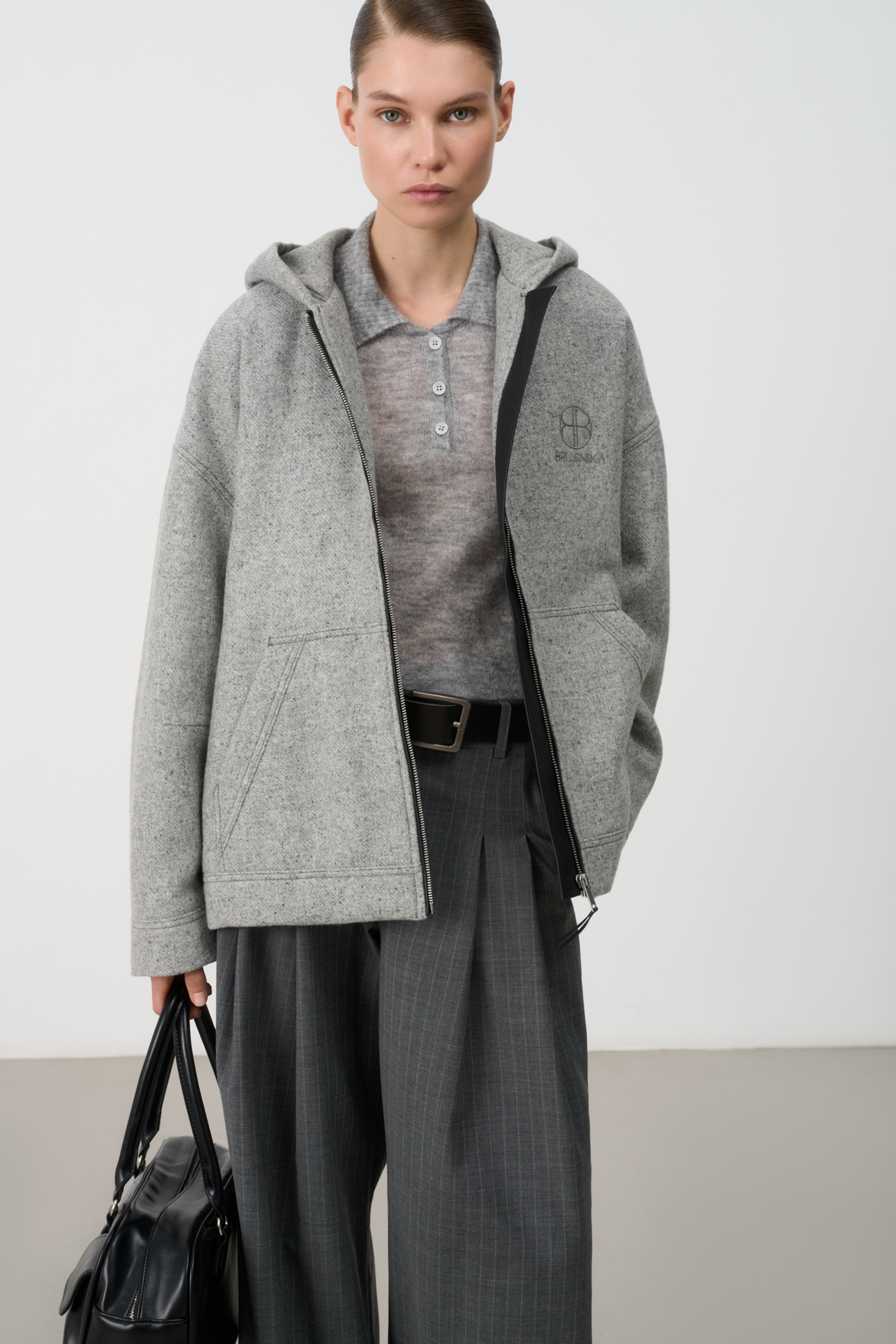 Loose bomber jacket with a hood. Model with dropped shoulders and side pockets. Embroidered brand logo on the chest. Zip closure. Lined.