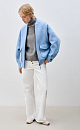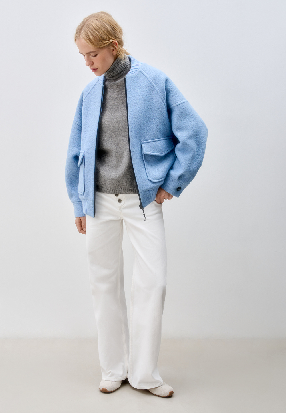 Oversized wool bomber jacket. Ribbed neckline and hem. Two front pockets with flaps. Front zip fastening.