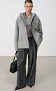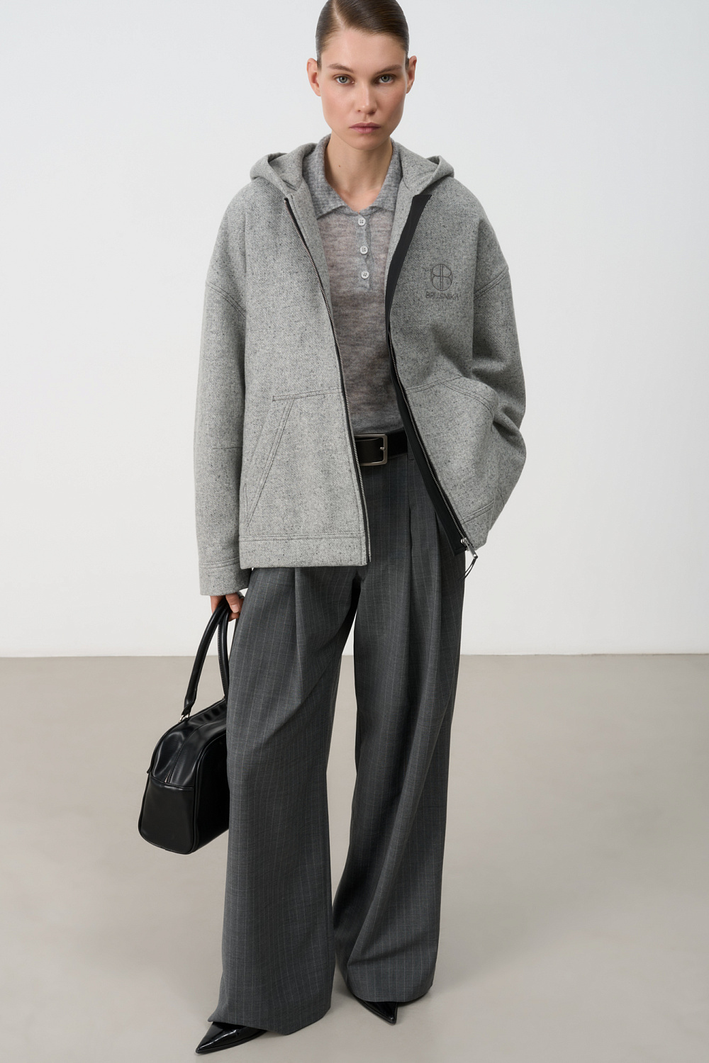 Loose bomber jacket with a hood. Model with dropped shoulders and side pockets. Embroidered brand logo on the chest. Zip closure. Lined.