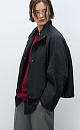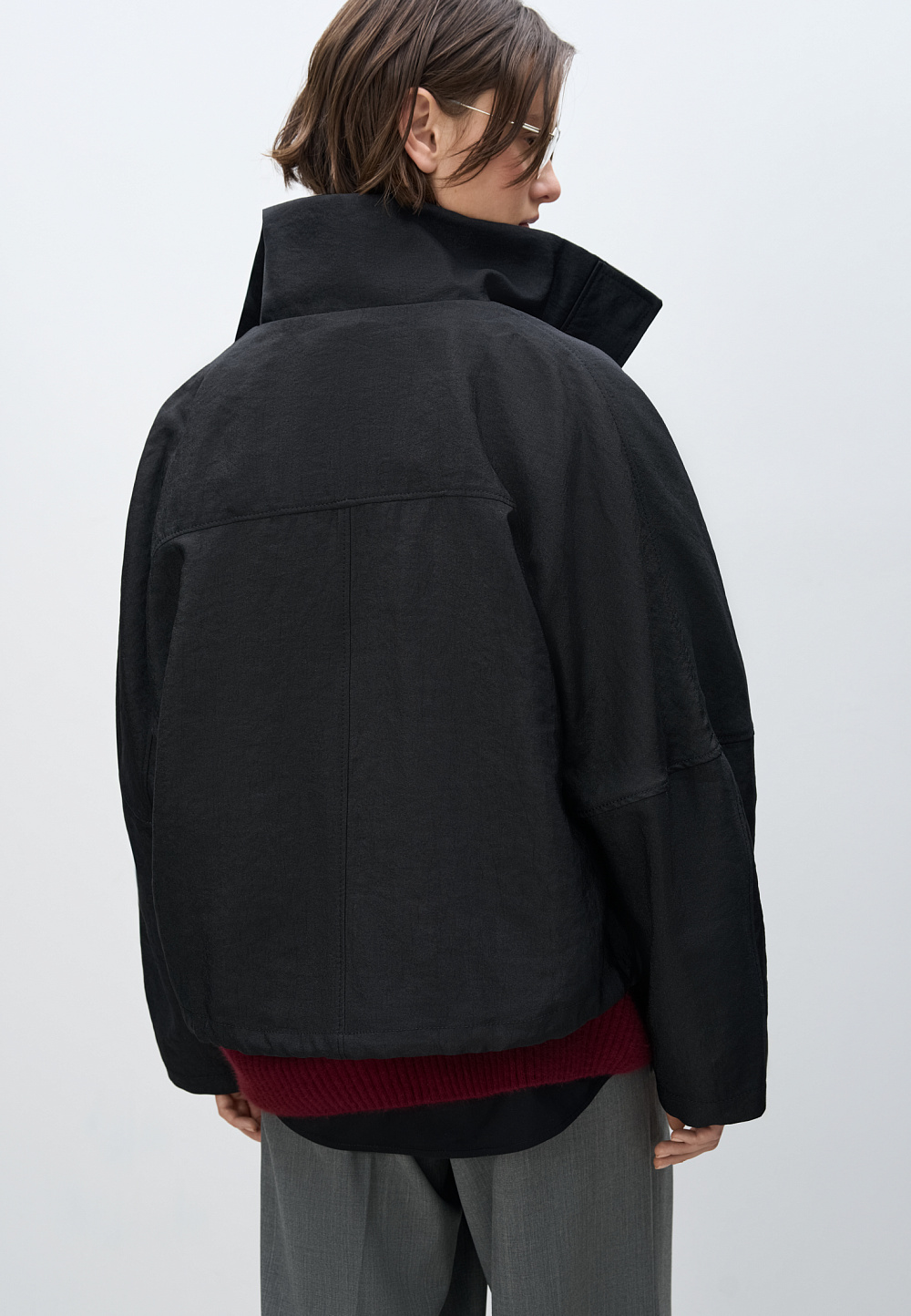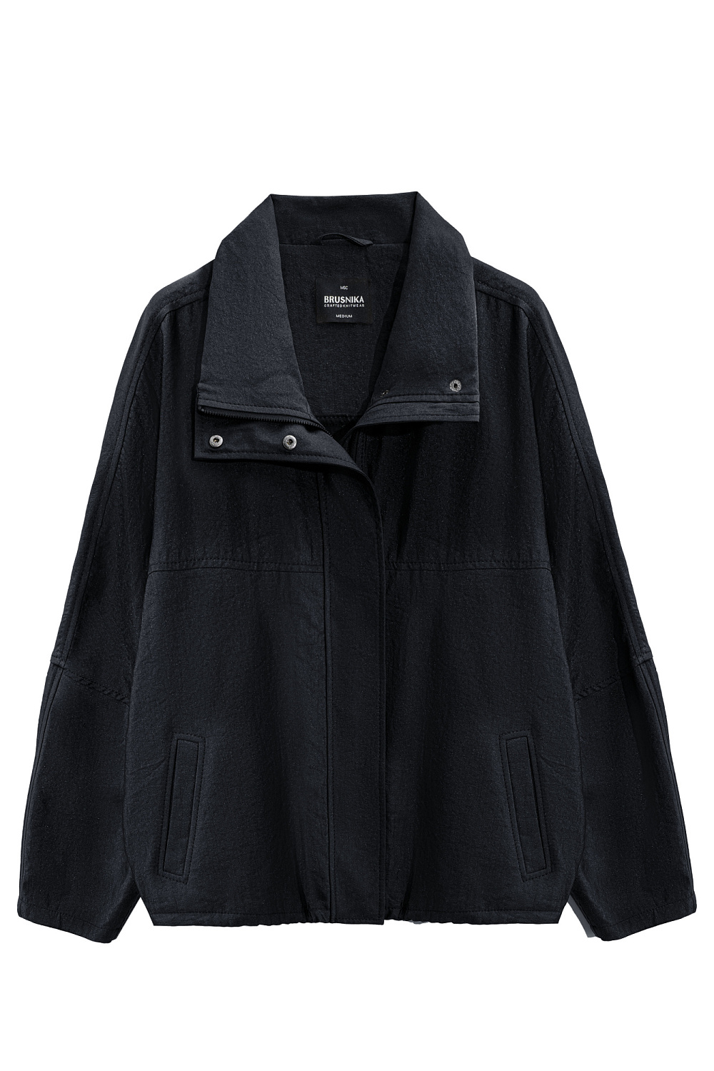 Viscose bomber jacket with stand-up collar. Loose silhouette model with dropped shoulders and side pockets. The bottom of the product is made with elastic. Zip fastening under the placket with buttons.