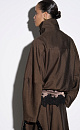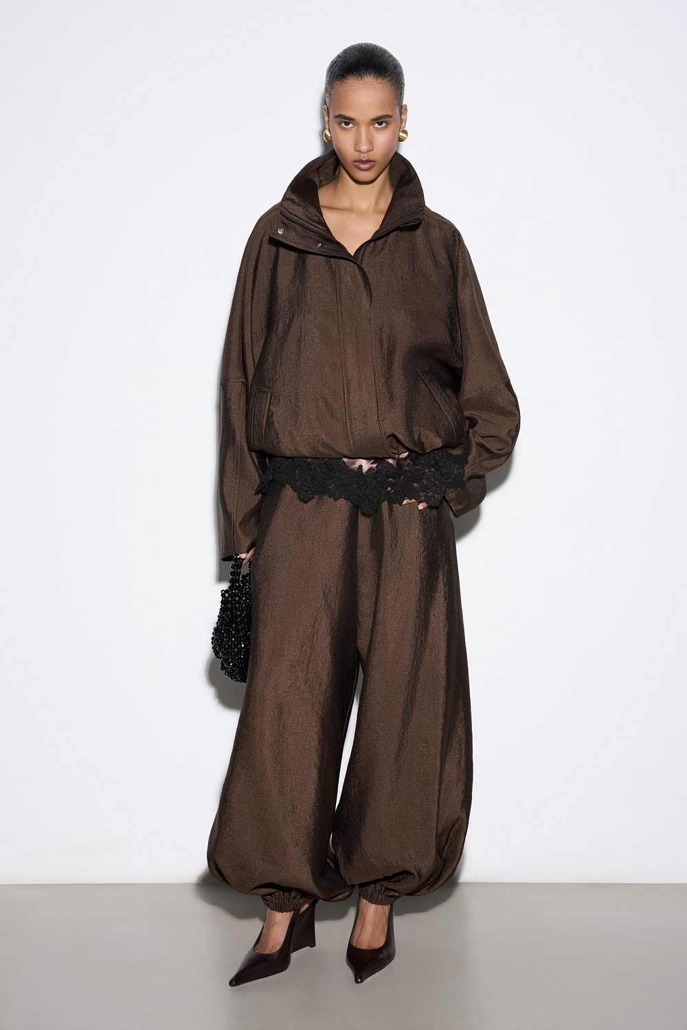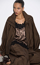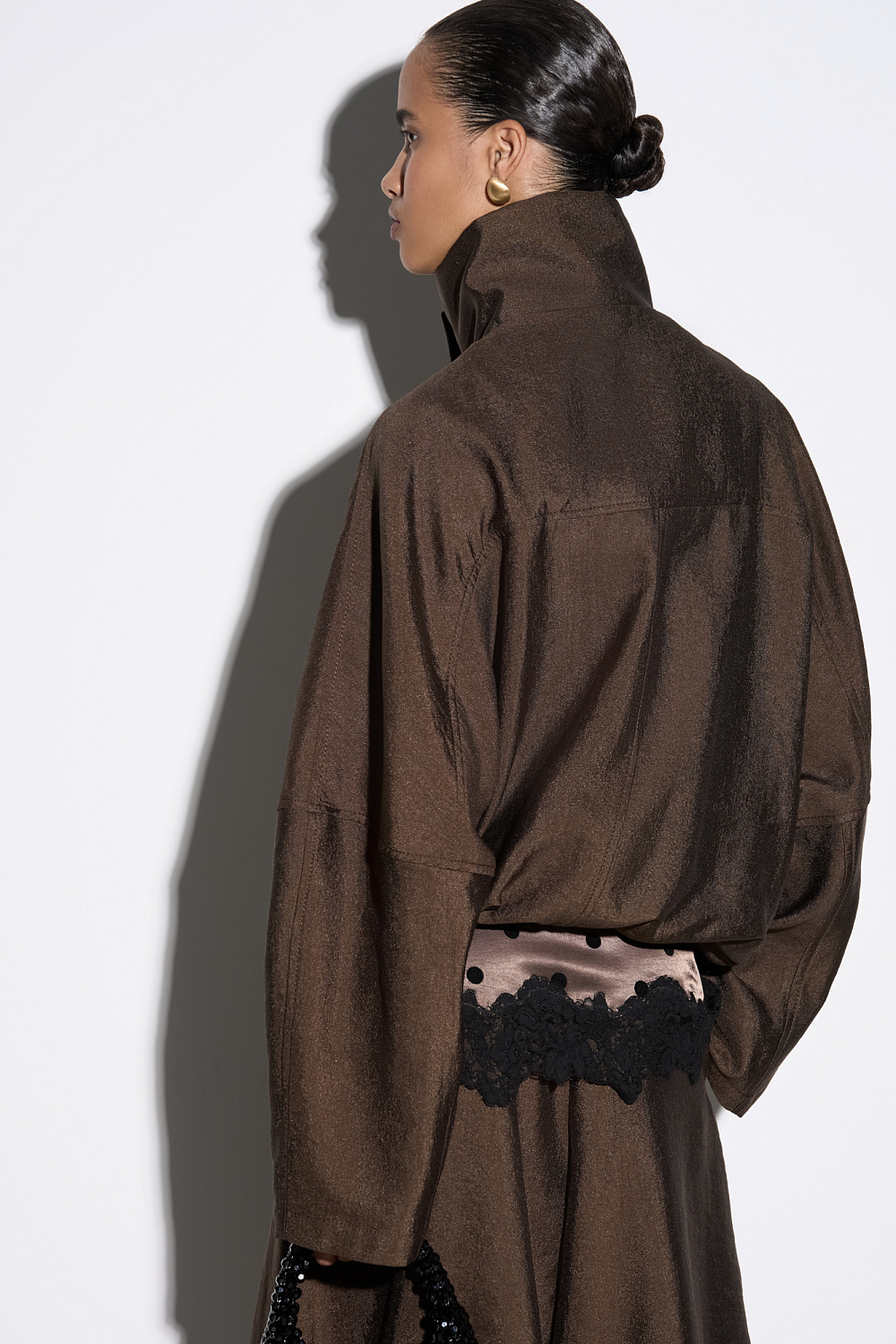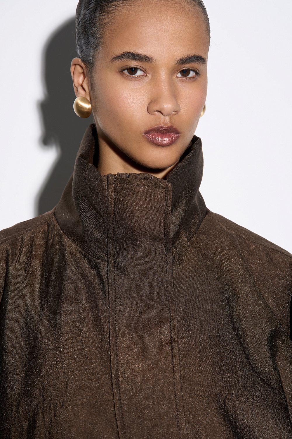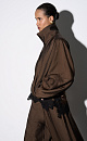 Viscose bomber jacket with stand-up collar. Loose silhouette model with dropped shoulders and side pockets. The bottom of the product is made with elastic. Zip fastening under the placket with buttons.