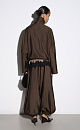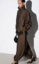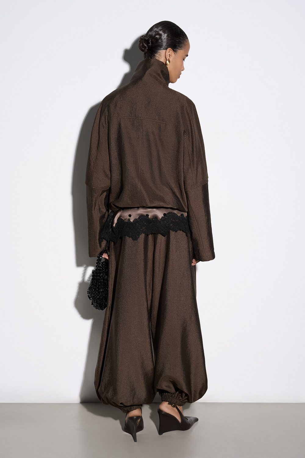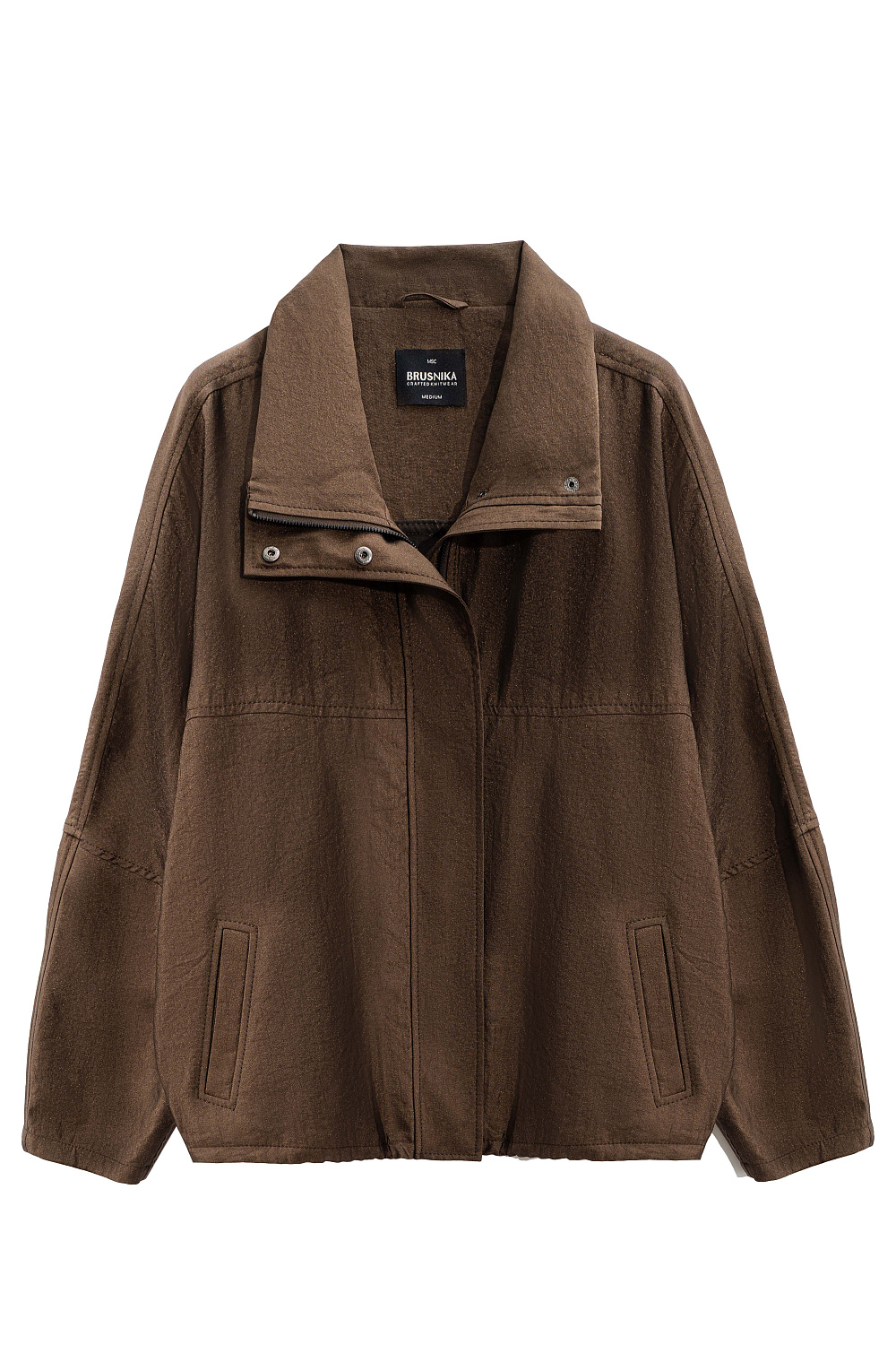 Viscose bomber jacket with stand-up collar. Loose silhouette model with dropped shoulders and side pockets. The bottom of the product is made with elastic. Zip fastening under the placket with buttons.