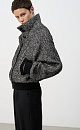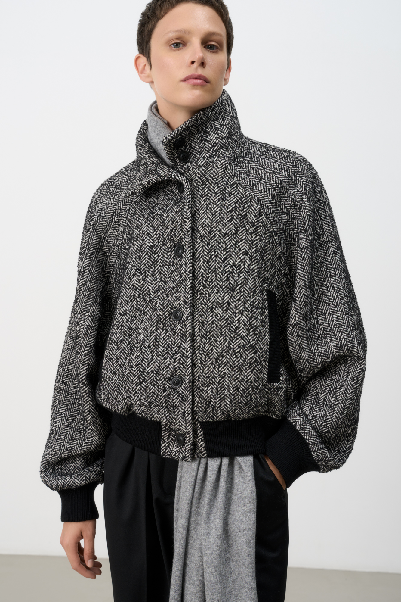 Oversized wool bomber jacket with stand-up collar. Shoulder pads and side pockets. Long sleeves with elasticated cuffs. Button closure. Lined.