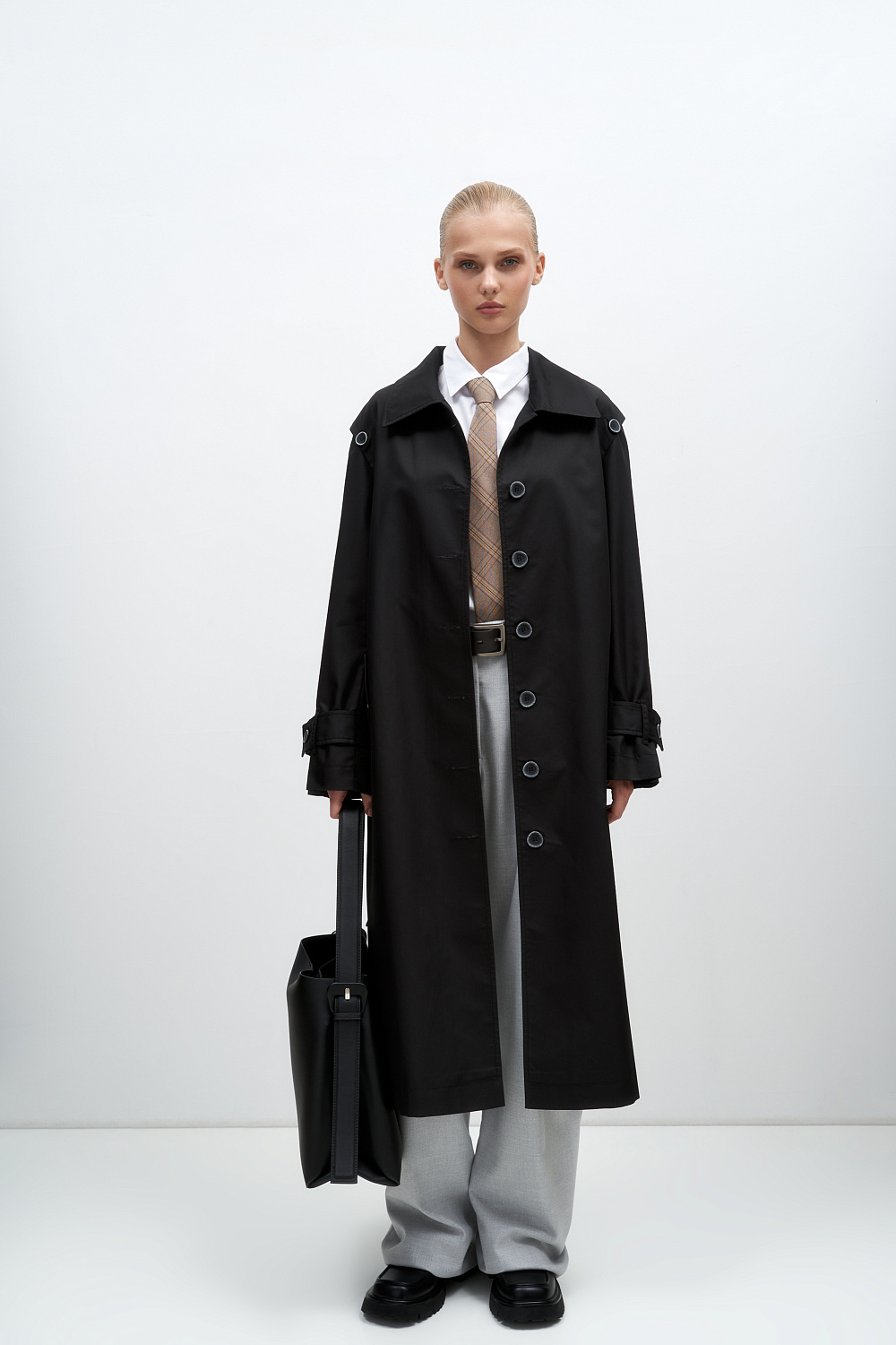 Transformer straight-cut trench coat with turn-down collar. Button fastening at the back. Detachable sleeves with buttons allow you to wear this trench coat in two ways: as a trench coat and as a vest. Belt with buckle included.