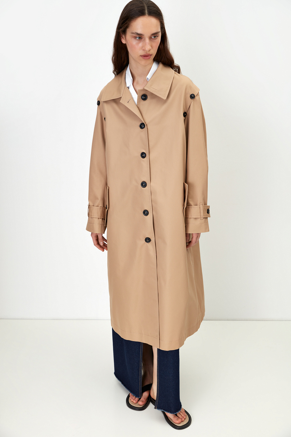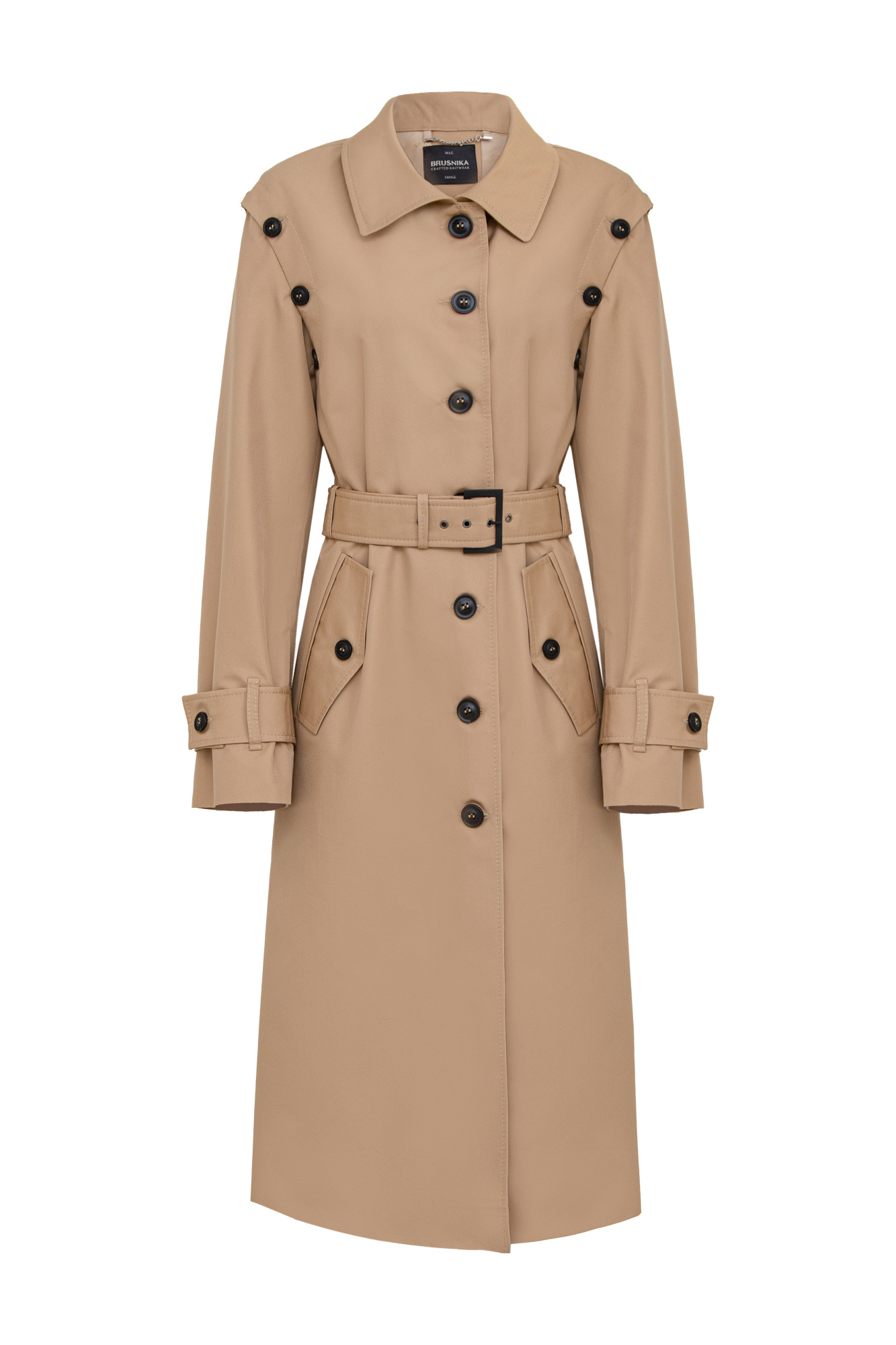 Transformer straight-cut trench coat with turn-down collar. Button fastening at the back. Detachable sleeves with buttons allow you to wear this trench coat in two ways: as a trench coat and as a vest. Belt with buckle included.