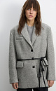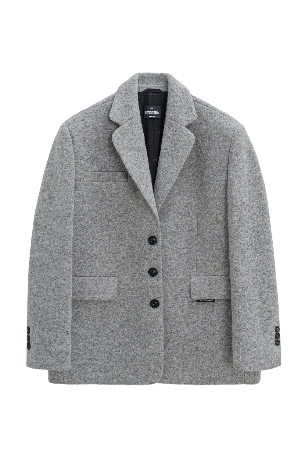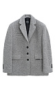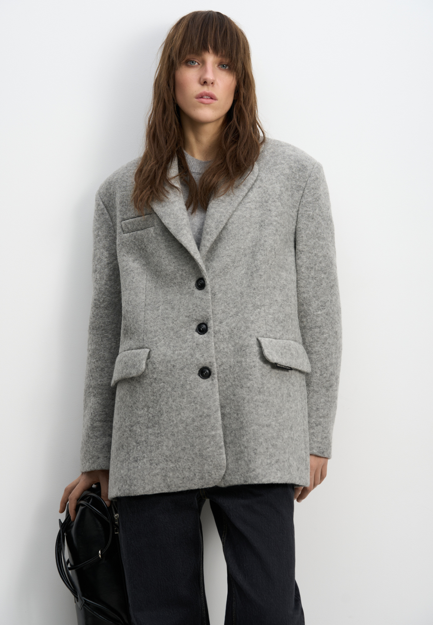 Single-breasted wool jacket-coat. Straight-cut model with a classic turn-down collar and two welt pockets with flaps. Button closure. The product is decorated with buttons on the cuffs and a branded label on the pocket flap. Eco-leather belt included. Lined coat.