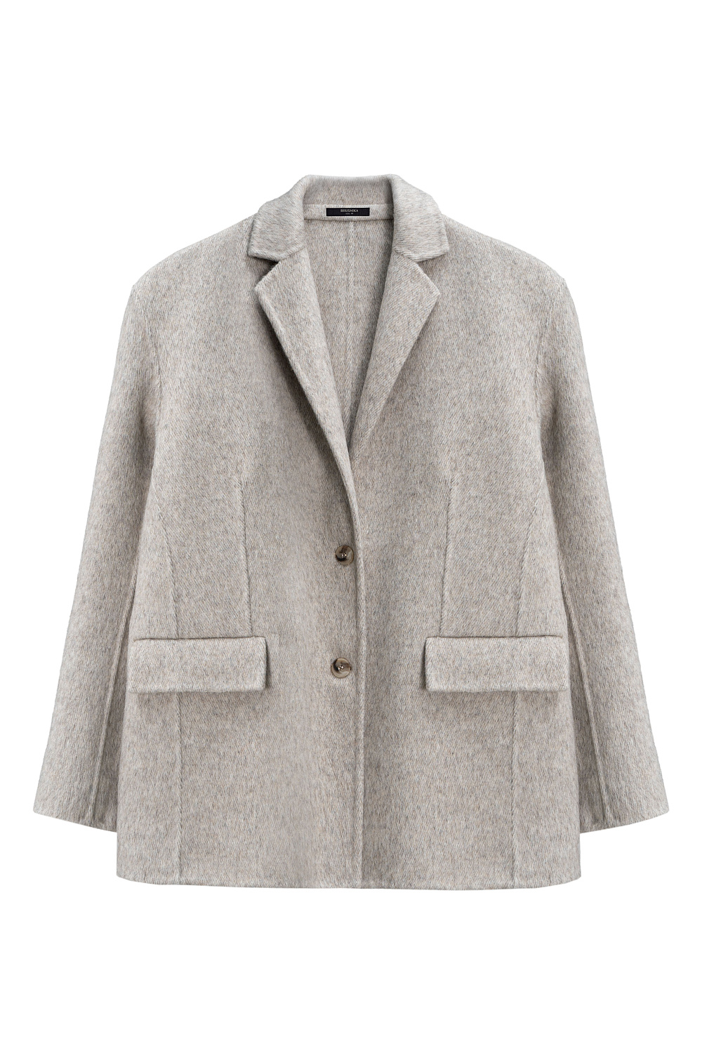 Single-breasted wool jacket-coat. Straight cut model with darts, classic turn-down collar and two welt pockets with flaps. Two button closure. The product is unlined. Double Face technology was used to create the back of the jacket; careful hand finishing of the seams ensures that there are no visible stitches on the front side.