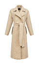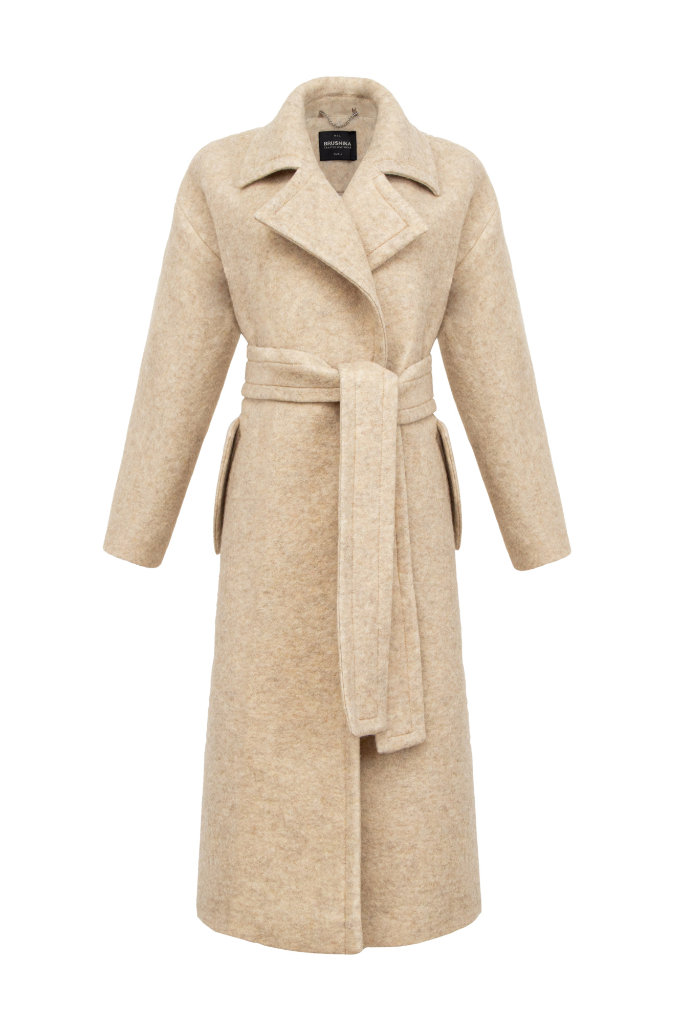 Felted wool wrap coat features detachable tie belt at the waist, collar with lapels and two side pockets.