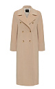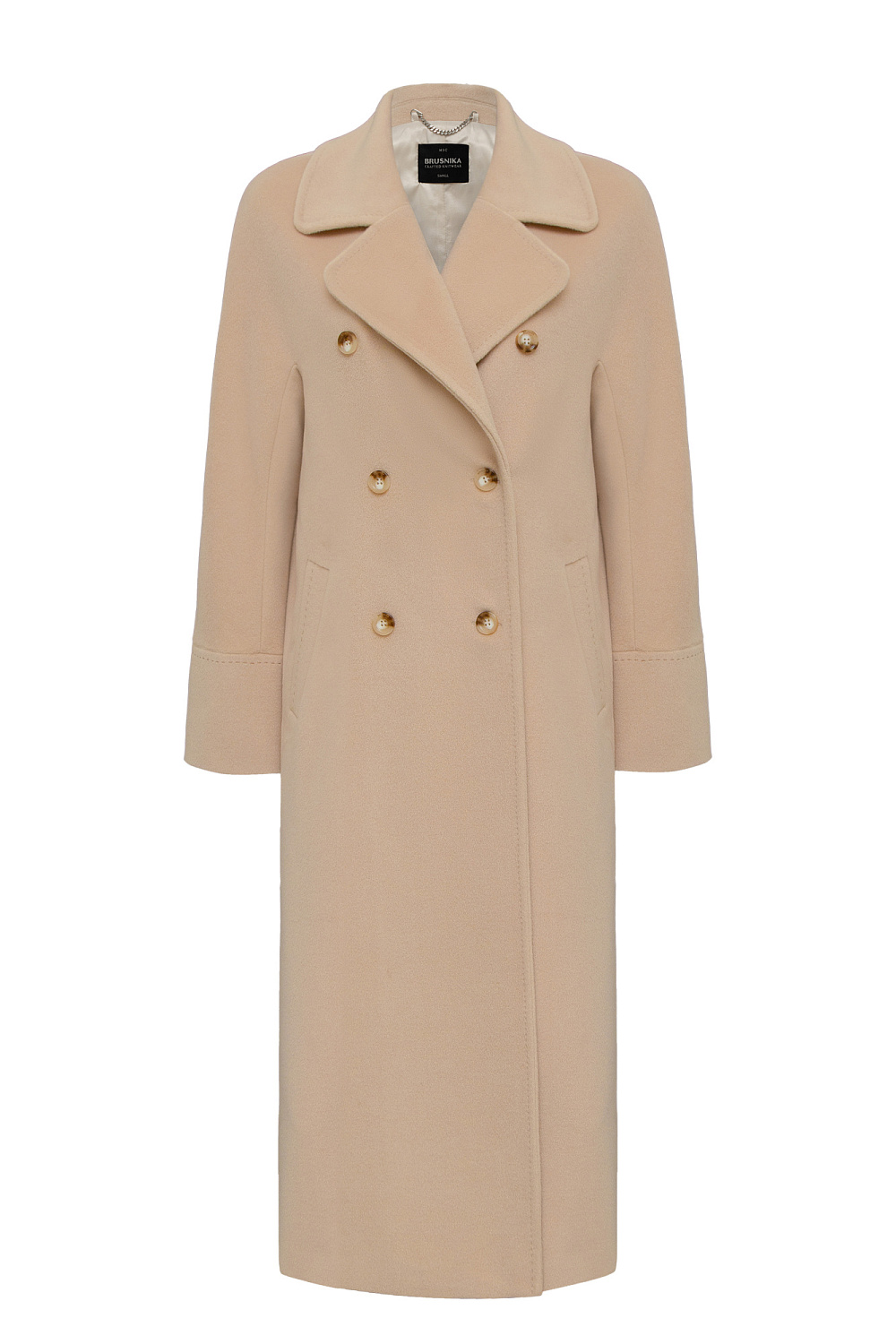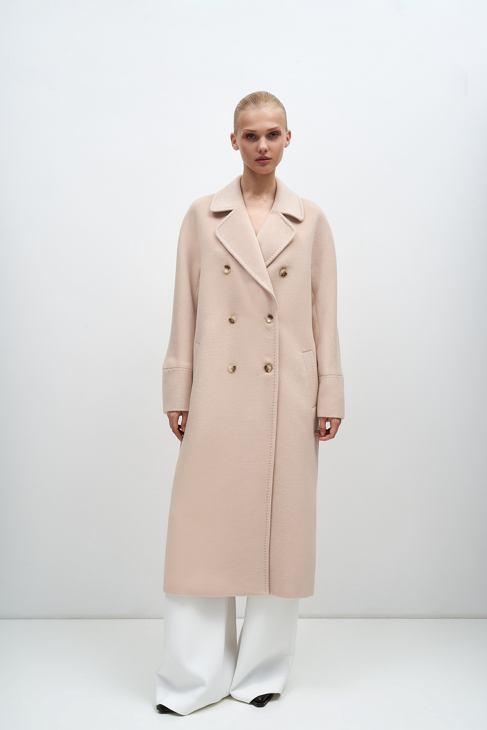 Double-breasted wool coat with pockets. Turn-down collar with notch lapels. Long sleeves. Front button closure.