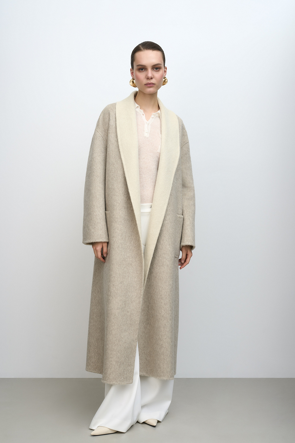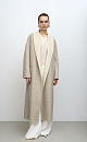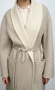 Robe coat made of double-sided fabric. Composed of 80% wool with the addition of 10% angora and 10% silk. Turn-down collar, patch pockets and and a detachable tie belt at the waist. Double-face technology was used when sewing, thanks to which the inside looks as neat as the outside.