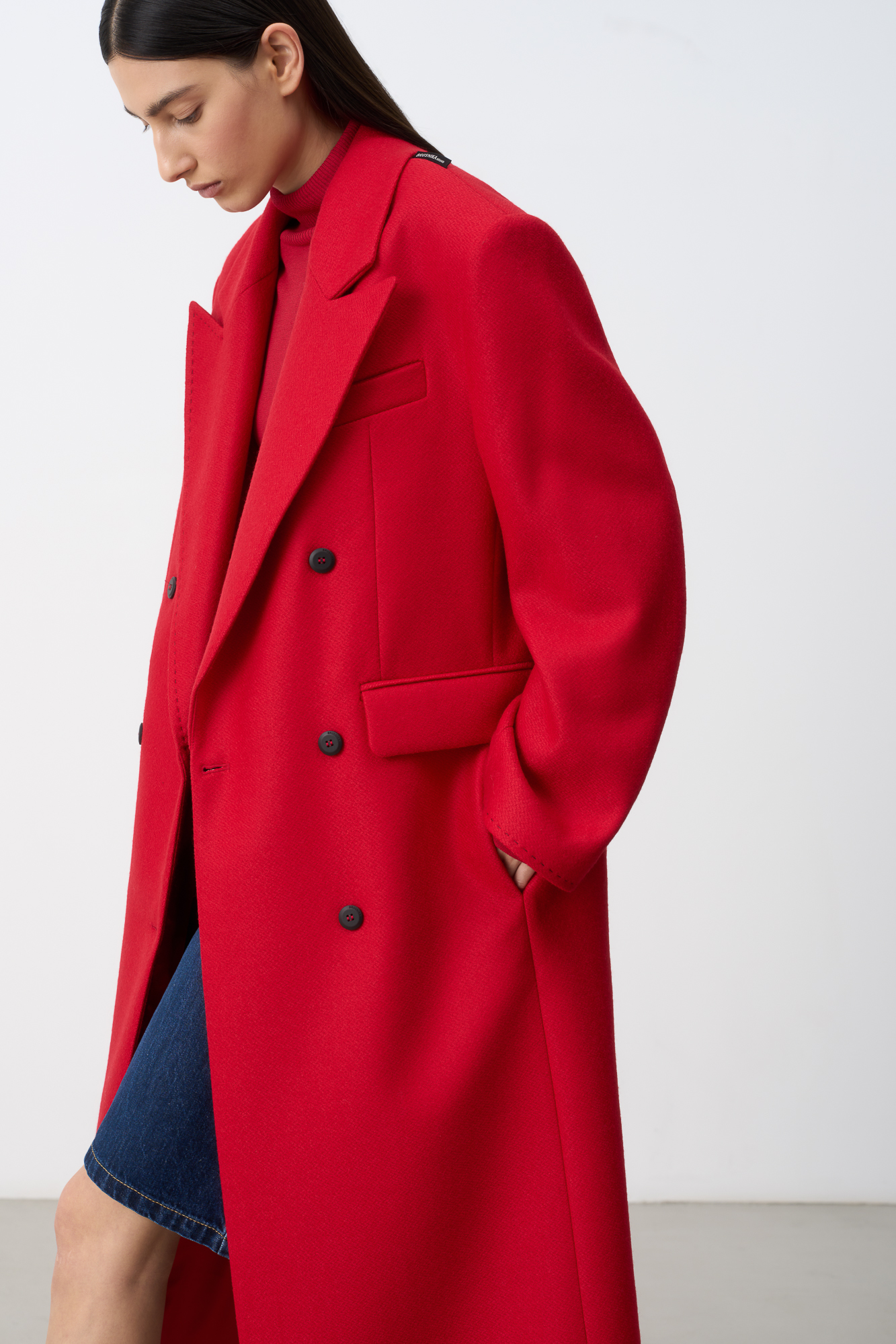 Loose-fit double-breasted coat with lapel collar, side pockets, logo at the back and button closure. Lined.