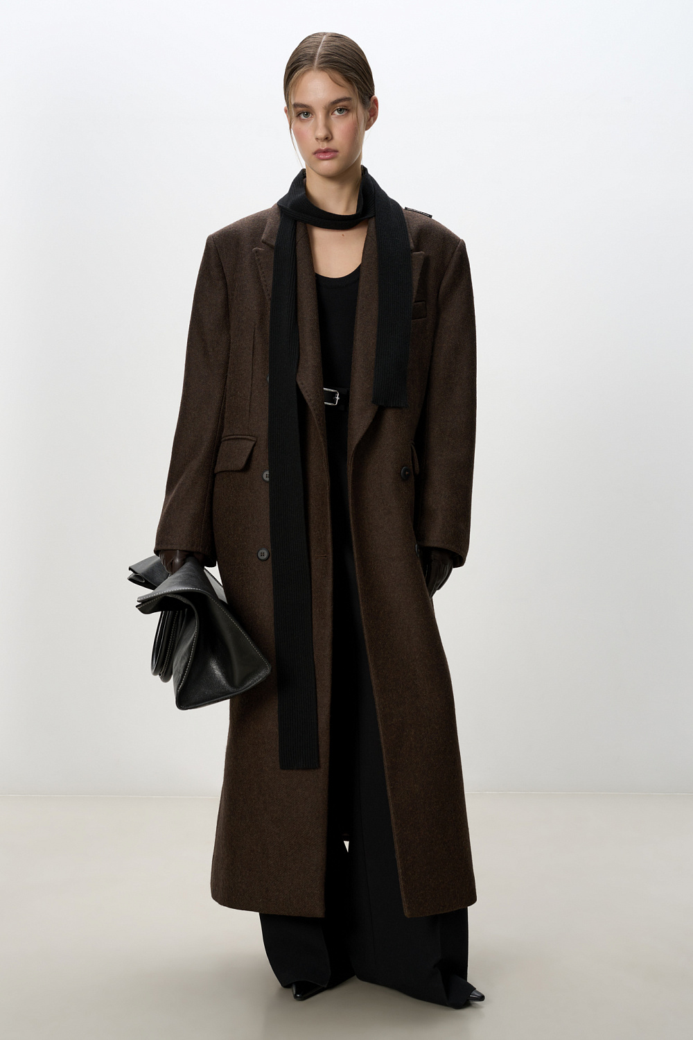 Loose-fit double-breasted coat with lapel collar, side pockets, logo at the back and button closure. Lined.