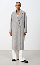 Double-breasted wool coat. The model has a loose silhouette with dropped shoulders, a turn-down collar and rectangular lapels. No lining.