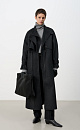 Single-breasted coat with an asymmetrical yoke and a drawstring at the waist. Loose silhouette model with dropped shoulders and side pockets. Patches on the cuffs. No lining.