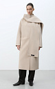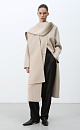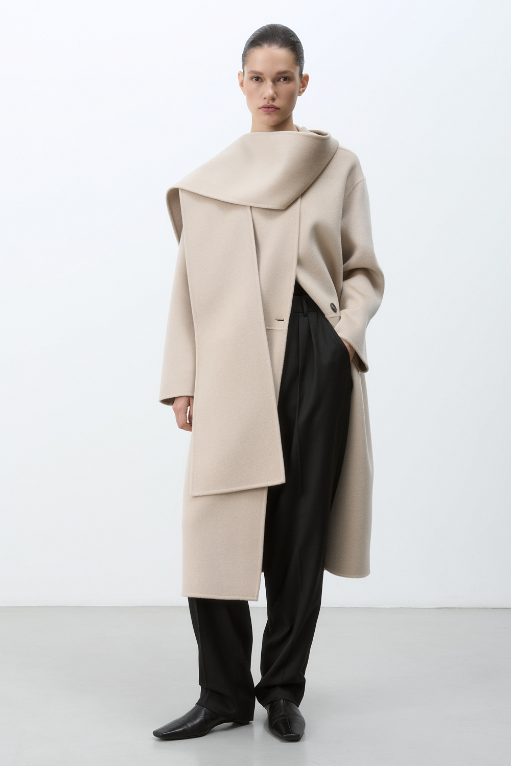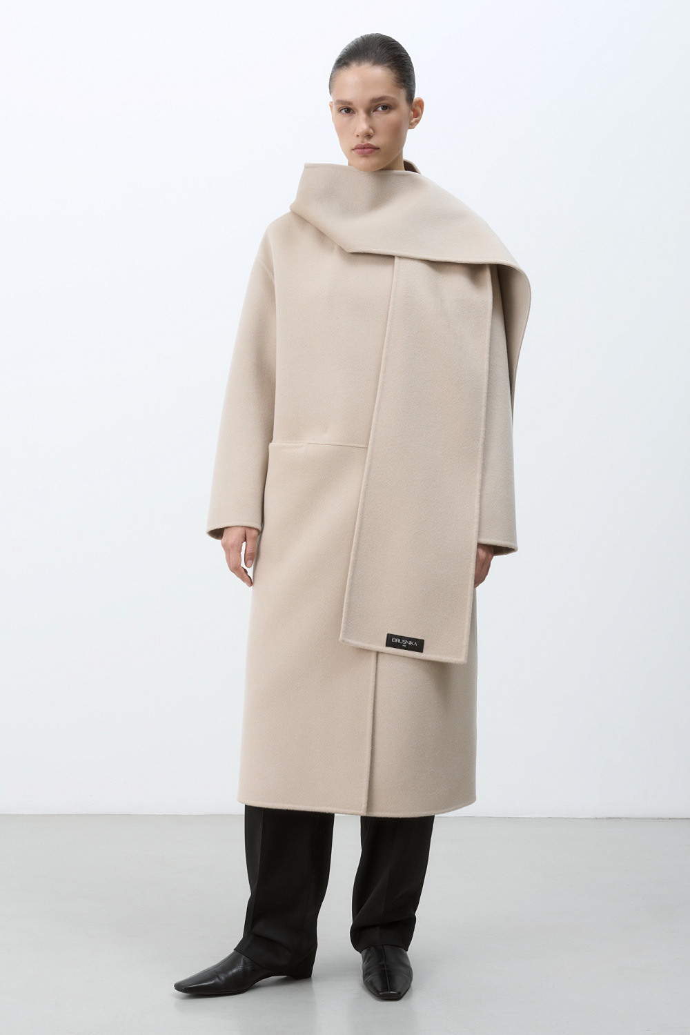 Coat made of soft wool fabric. Loose silhouette model with welt pockets. The hood goes into a collar and scarf. Branded label on the scarf.